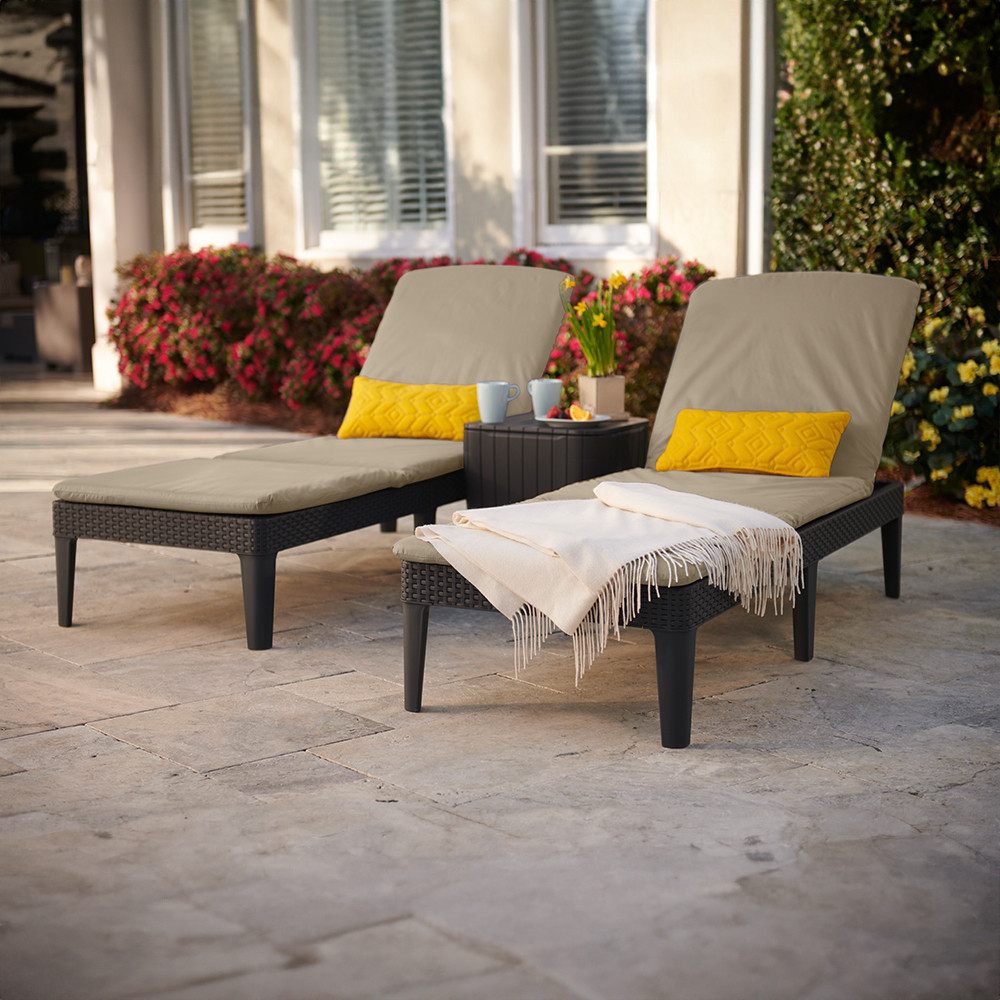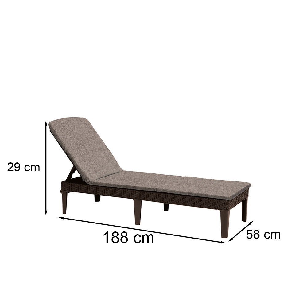 Șezlong funcțional Jaipur, cu un design al suprafeței care amintește de ratanul natural. Datorită structurii sale bine gândite, șezlongul poate fi pliat la dimensiunea unui bagaj mic și practic. Spătarul reglabil în 4 poziții sporește confortul. Se poate curăța cu o cârpă moale și apă cu detergent. Este rezistent la condiții meteorologice nefavorabile și la radiațiile UV.