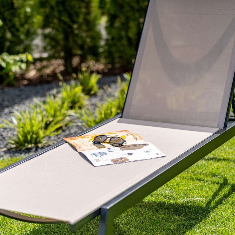 Acest șezlong de grădină cu cadru din aluminiu este foarte rezistent la coroziune , așa că poate fi folosit mai multe sezoane. Datorită opțiunilor de ajustare, oferă o odihnă confortabilă. Designul său modern se potrivește perfect în cele mai la modă terase și grădini.
