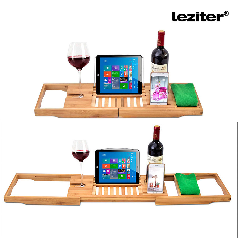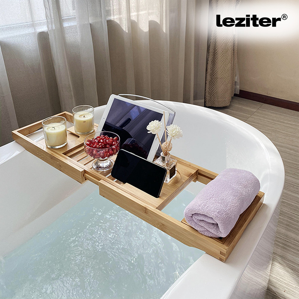 Tava reglabilă pentru cadă din bambus de la Leziter vă ajută să creați relaxarea perfectă. Suportul pentru tabletă și carte oferă o fixare stabilă, suportul pentru paharul de vin oferă un loc sigur, iar compartimentele separate pot găzdui și un telefon și alte obiecte mici .