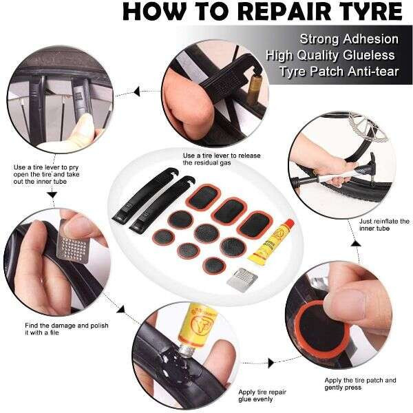 1 × kit de reparații pentru cauciuc (lipici, fișier, 8 petice, 2 camere de aer) - Material: plastic ABS