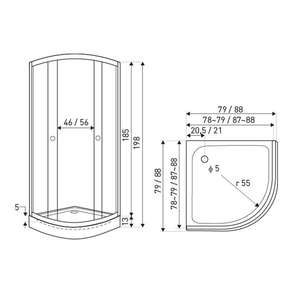 Cabina de duș este fabricată din sticlă securizată de 4 mm şi Este echipat cu sticlă securizată . Cabina de duș este disponibilă într-un design curbat. Este echipat cu uși duble tip rulou. Cabina are dimensiunile de 80x80x185 cm. Dimensiuni ( înălțime totală cu tavă: 198 cm ). Dimensiunile cădiței de duș din acril alb 79x79x13 cm !