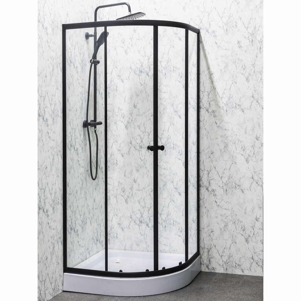 Are pereți din sticlă securizată de 4 mm . Profilele cabinei de duș sunt din aluminiu negru .