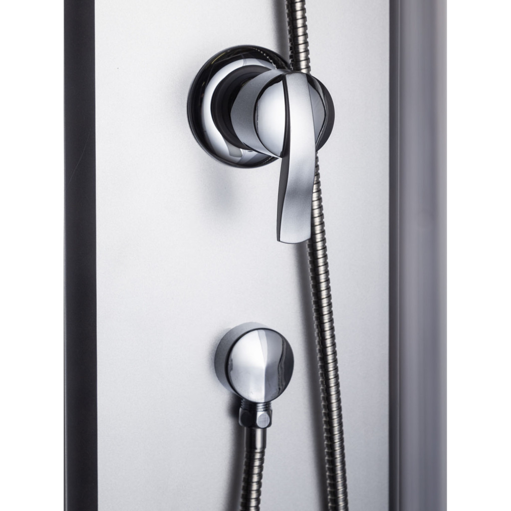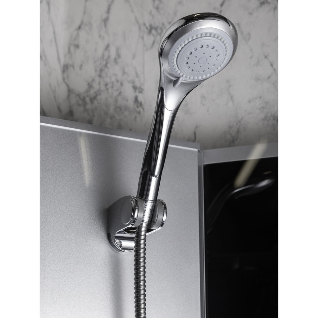 Cabina este dotată cu un scaun rabatabil, un robinet și un set de duș.