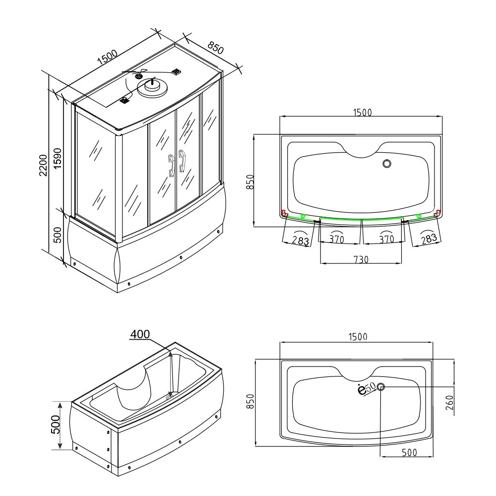 Cabina este înconjurată de sticlă securizată cu grosimea de 5 mm, care îmbunătățește aspectul estetic cu geam fix și panouri de ușă gri închis și pereți din sticlă neagră. Șinele de ghidare și profilele cromate mate sporesc și mai mult eleganța produsului, în timp ce panoul funcțional cromat mat este punctul central al opțiunilor de control. Cabina dispune de 6 jeturi de hidromasaj, care garantează o experiență de masaj pentru întregul corp, în timp ce radioul încorporat, ventilatorul, iluminarea de fundal cu LED și iluminatul de plafon sporesc și mai mult experiența de relaxare.