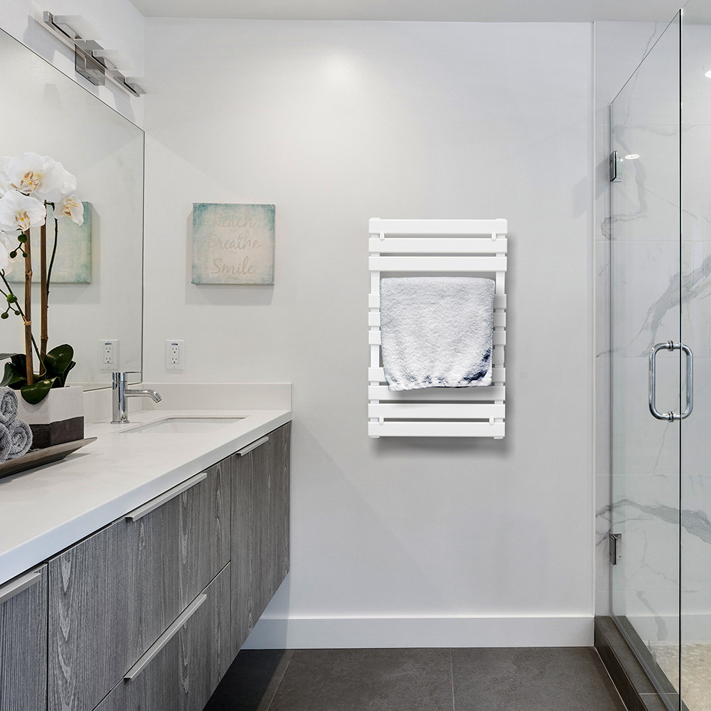Radiatorul nostru electric pentru prosoape, cu o putere de 500W, este disponibil într-o elegantă culoare albă, fiind o alegere perfectă pentru orice baie modernă.