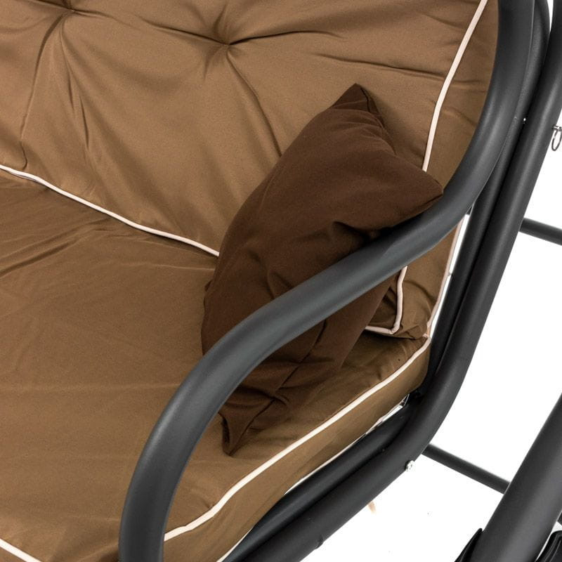 Leagănul de grădină are cotiere , ceea ce sporește semnificativ confortul șezutului. Setul include perne de șezut cu tetiere și perne decorative. Leagănul de grădină acoperit are rafturi pentru băuturi , perfecte pentru a vă relaxa împreună la aer curat.