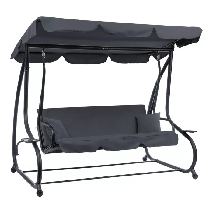 Balansoarul de grădină cu 3 locuri vă permite să vă relaxați alături de cei dragi în grădină sau pe terasă. Este echipat cu o copertină solară reglabilă care protejează eficient împotriva luminii solare. Poate fi ajustat optim în funcție de nevoile utilizatorului. Datorită funcției de pliere a scaunului utilizată în construcție, balansoarul vă permite să vă relaxați în orice poziție. Structura din oțel asigură stabilitatea și durabilitatea întregii piese de mobilier. Acoperișul, șezut și pernele sunt fabricate din poliester, care este mai rezistent la umiditate, fiind perfect pentru utilizare în exterior.
