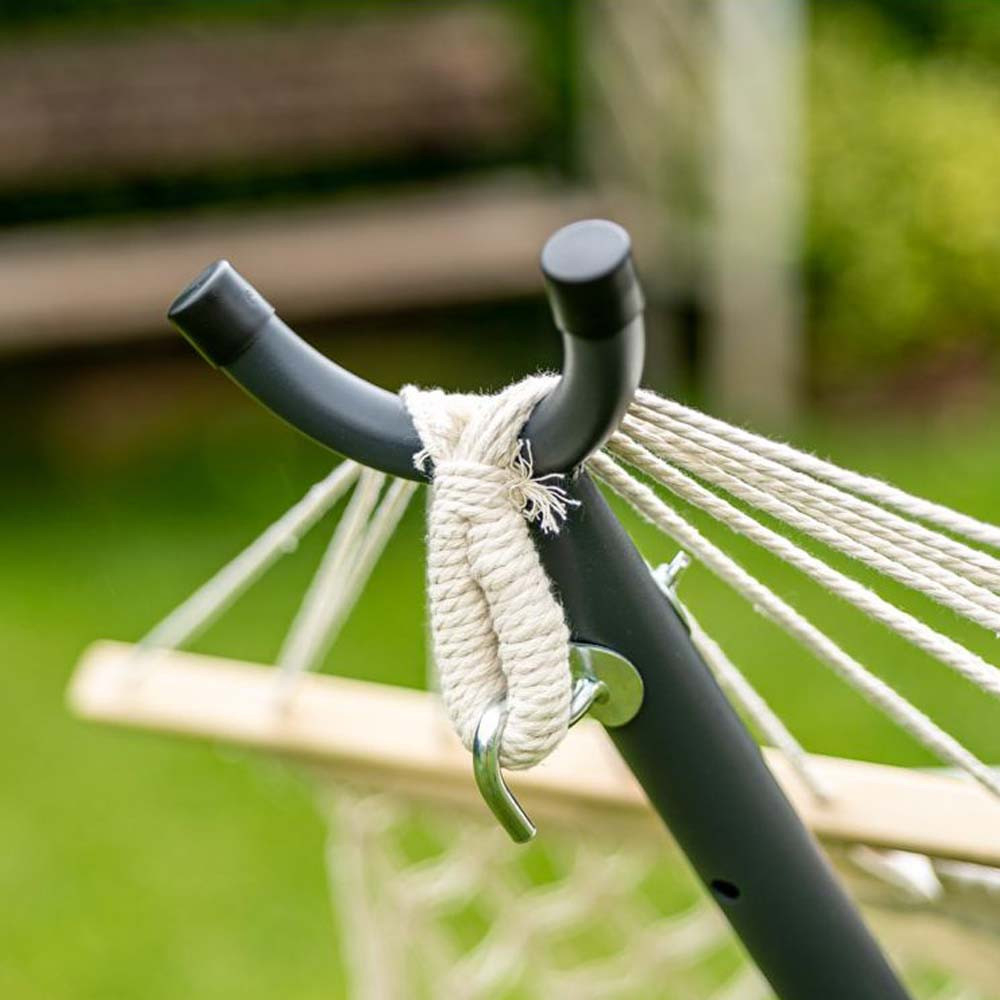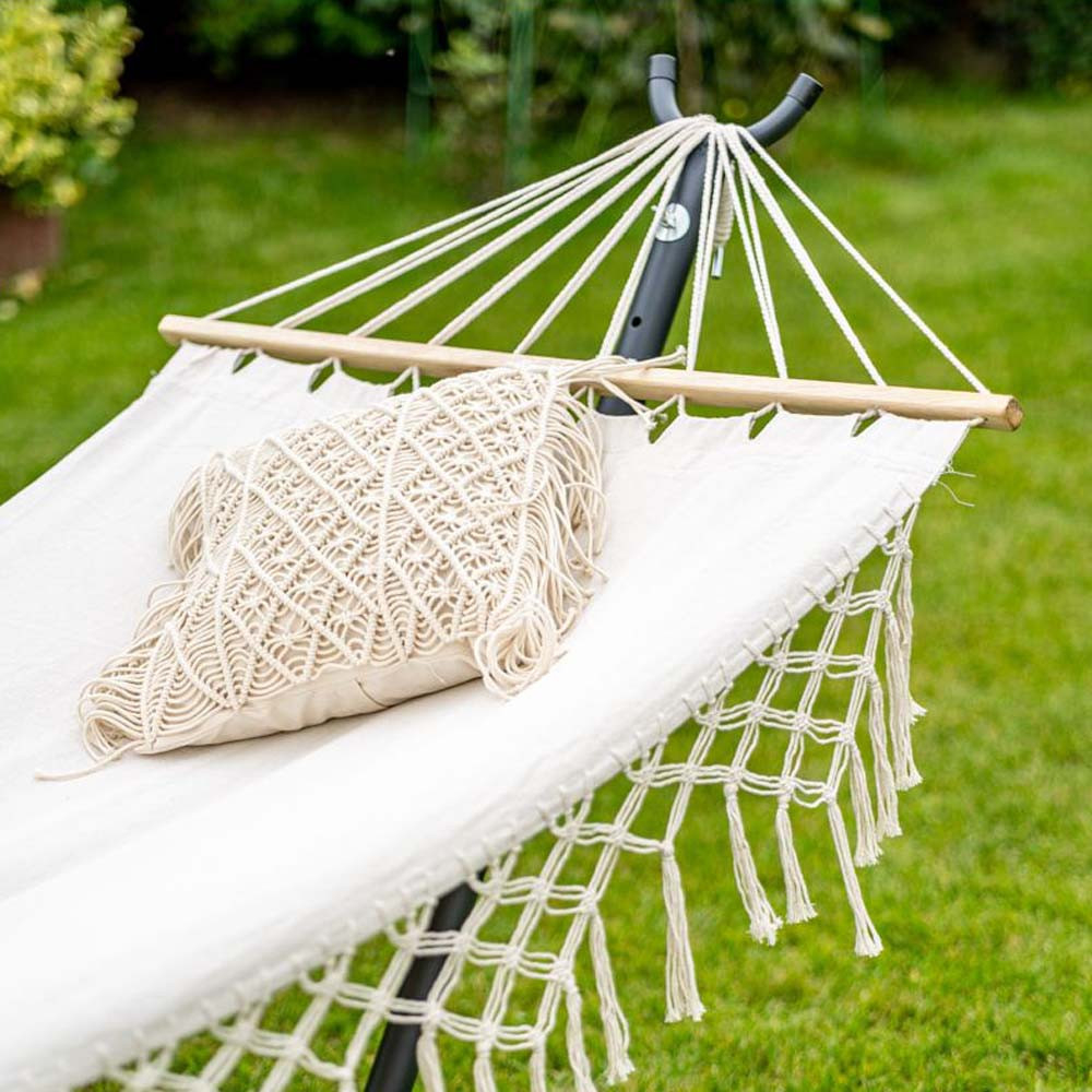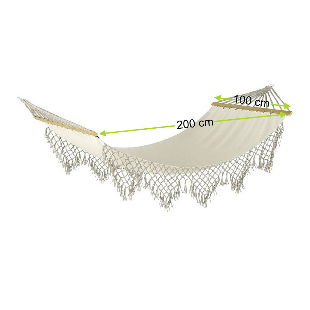 Hamacul de grădină din bumbac este fabricat din bumbac plăcut la atingere . Frânghiile robuste asigură o durată lungă de viață. Numărul crescut de frânghii permite o distribuție uniformă a greutății , ceea ce îmbunătățește confortul în utilizare. Grinzile ajută la menținerea poziției corecte a utilizatorului.