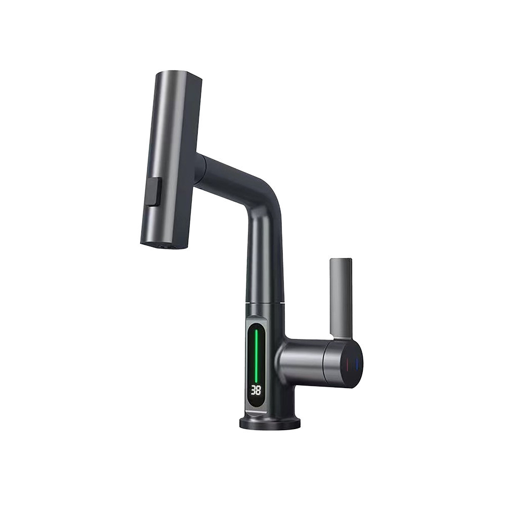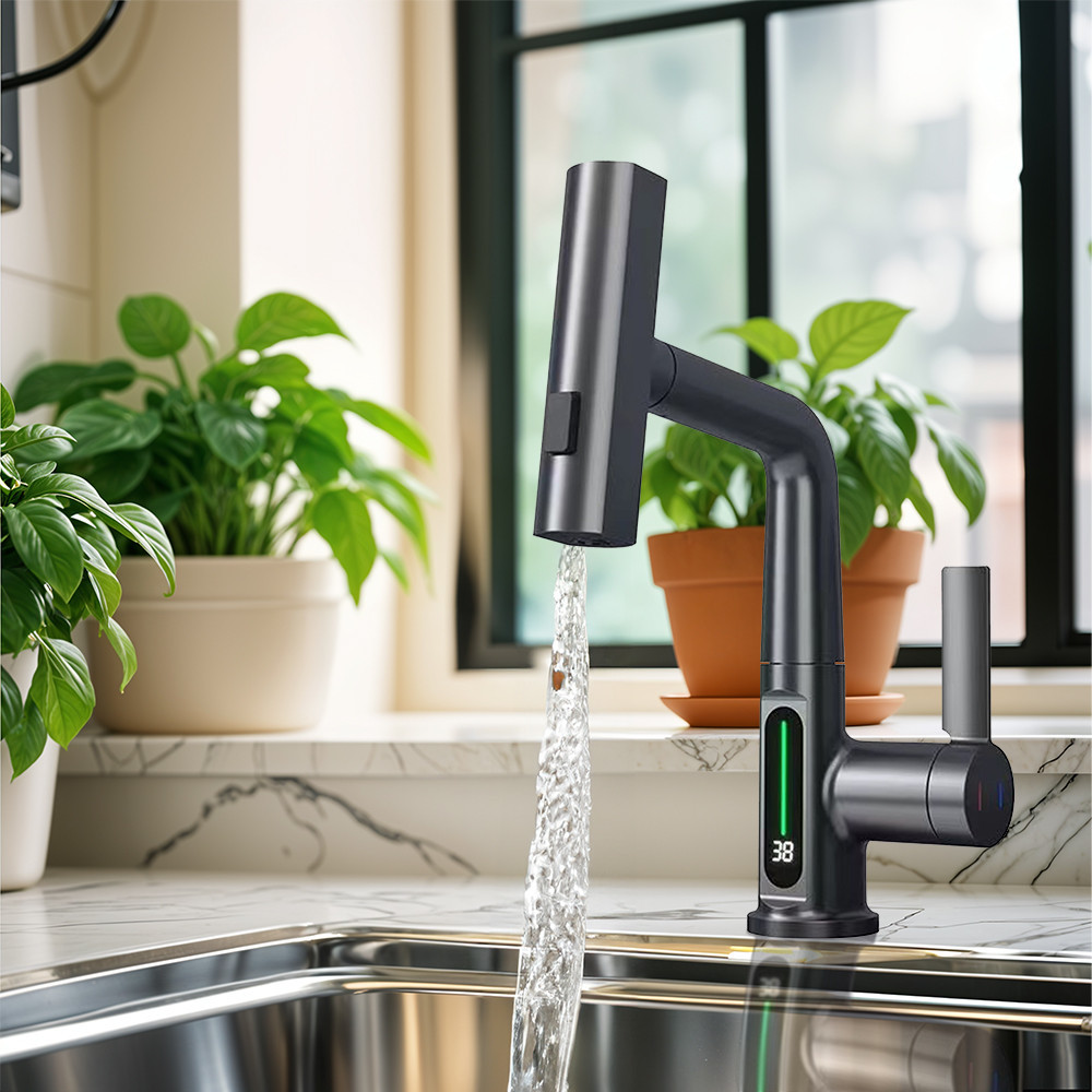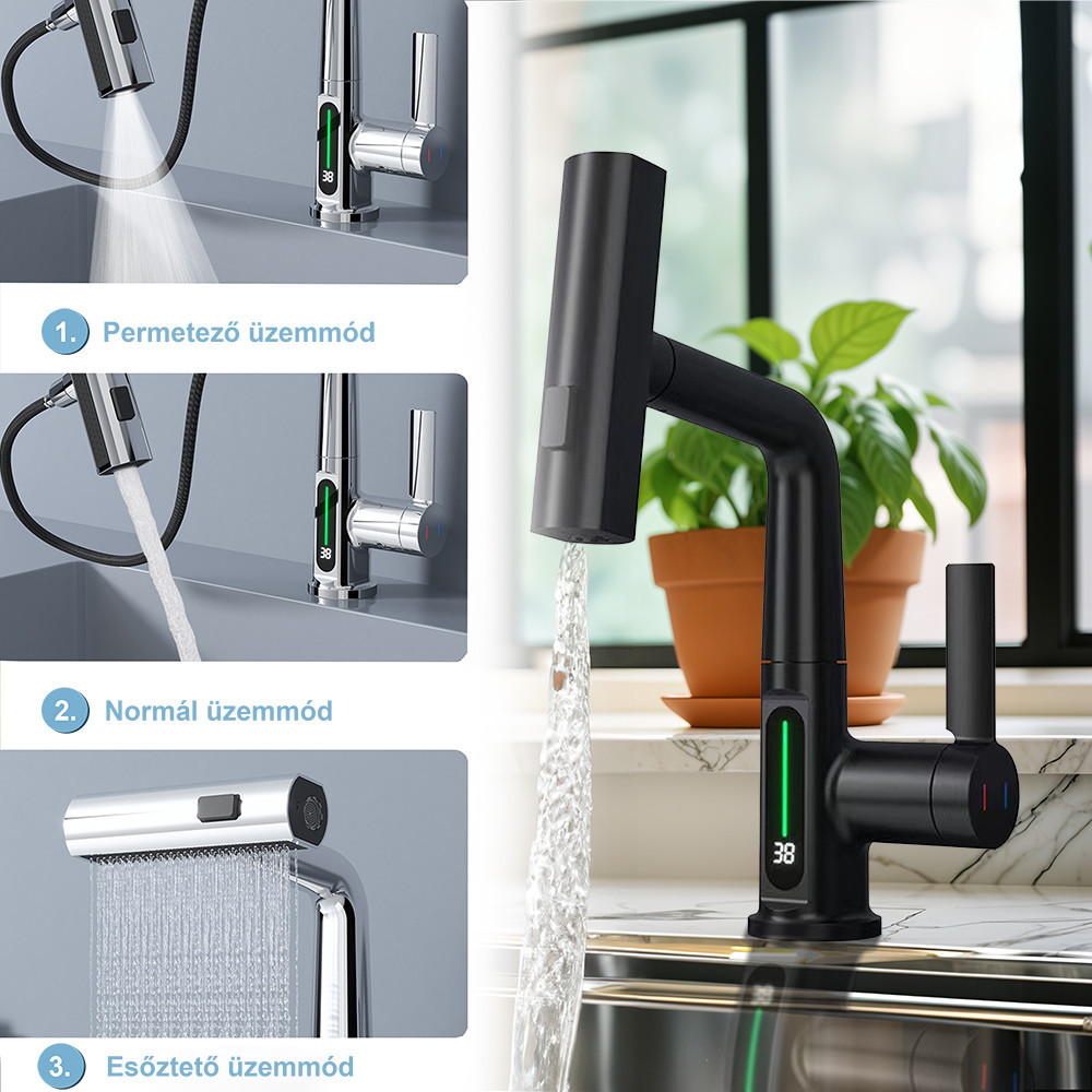 Există un afișaj digital al temperaturii pe robinet? Da, robinetul are un afișaj digital încorporat pentru temperatură, care arată cu precizie temperatura apei folosind diferite culori: albastru (0-30°C), verde (30-40°C) și roșu (40-49°C).