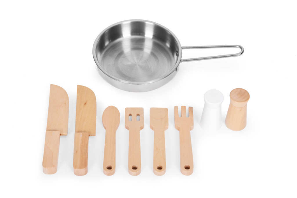 Bucătăria de joacă este concepută pentru a avea un loc pentru orice. Micul bucătar își pune cuțitele din lemn sigure într-un suport special, chiar lângă chiuvetă, și agață celelalte accesorii de bucătărie pe umerașe deasupra aragazului. Acest lucru vă va ajuta copilul să învețe să păstreze bucătăria ordonată.