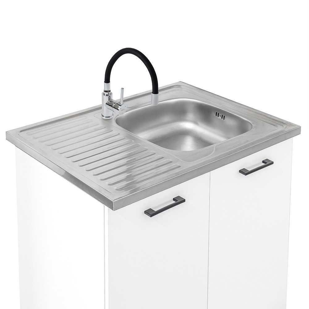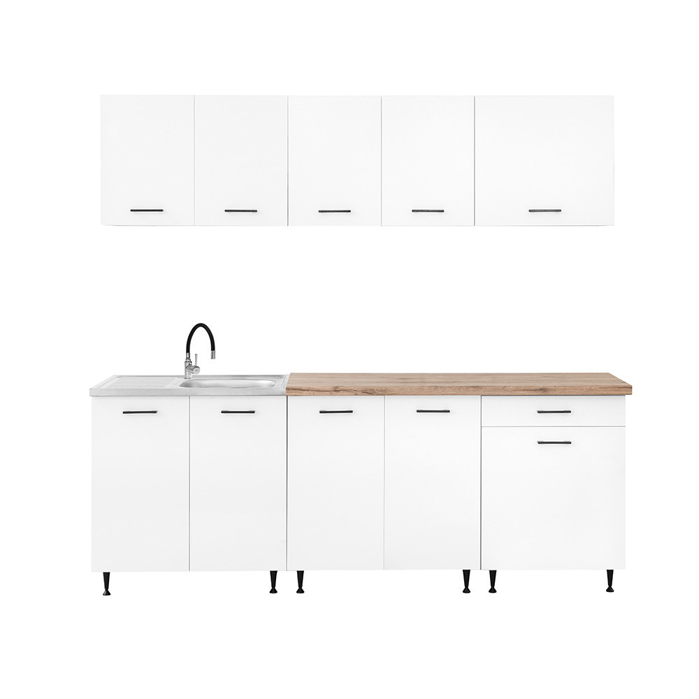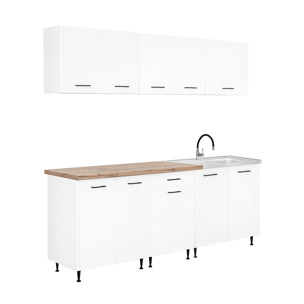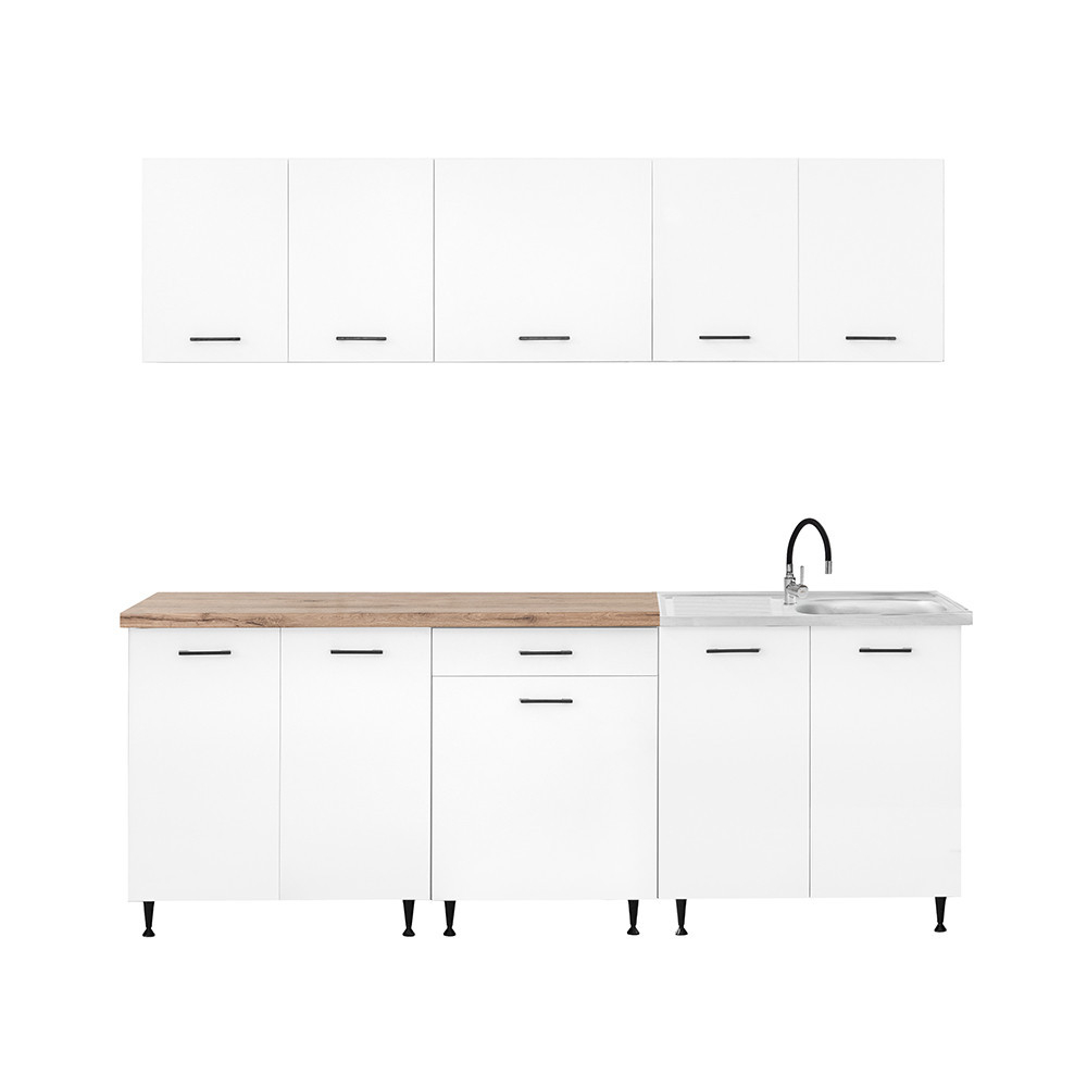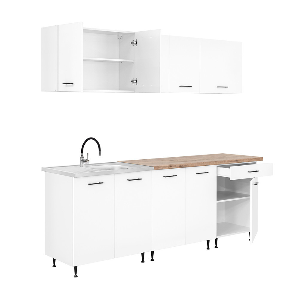 Unitatea de bucătărie cu lățimea de 220 cm este formată din trei dulapuri superioare și trei inferioare care oferă spațiu practic de depozitare pentru ustensilele de bucătărie. Cele două dulapuri inferioare cu lățimea de 80 cm sunt potrivite pentru oale mai mari sau ustensile de bucătărie, în timp ce unitatea cu sertare și uși de 60 cm este ideală pentru organizarea tacâmurilor și a accesoriilor mici.