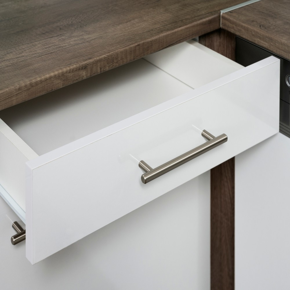 Mobilier de bucătărie modular de înaltă calitate, produs în țară, care va satisface nevoile oricărui client. Corp realizat din placă laminată pentru mobilier de 16 mm , de culoare stejar York. Când este asamblat, pinii ombilicali și șuruburile de confirmare îl fac suficient de solid. Blatul de lucru este fabricat peste elemente și are o grosime de 28 mm .