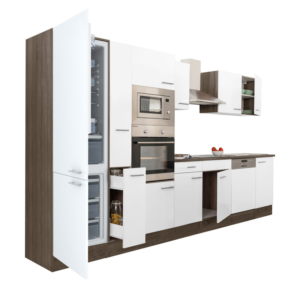 Dulapurile laterale de depozitare ale acestui produs pot fi asamblate în mai multe moduri . Dulapurile de cămară de 60 de inci pot fi folosite pentru a crea o combinație care poate găzdui un cuptor încorporat sau o combinație care poate găzdui un cuptor cu microunde . Cele 2 dulapuri de cămară de 60 de inci și dulapul de cămară de 30 de inci pot fi variate în funcție de gust. Cu frigider cu congelator inferior.