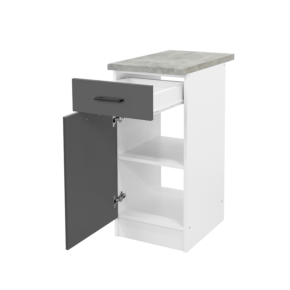 Dulapul de bază Praktik 40 cu corp alb și față antracit se potrivește în orice stil de design interior. Schema sa de culori luminoase extinde vizual spațiul, făcându-l o alegere ideală pentru bucătării mici, garaje și livinguri open space cu bucătării americane. Liniile sale curate sunt o soluție populară pentru locuințele moderne de astăzi.