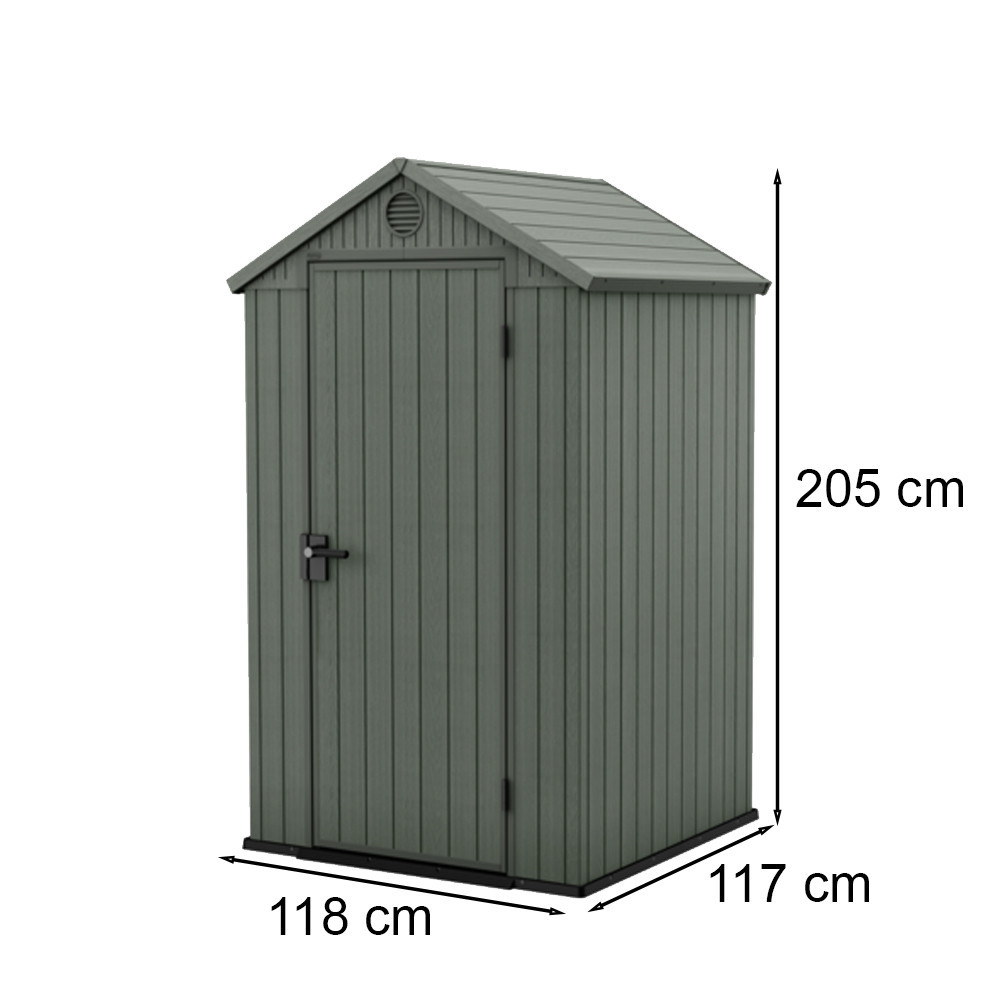 Dimensiunile sale sunt: 118 cm x 117 cm x 205 cm, ceea ce oferă spațiul ideal pentru depozitarea uneltelor de grădină, a mobilierului de grădină sau chiar a bicicletelor. Aceste dimensiuni se potrivesc perfect în majoritatea grădinilor, fără a ocupa prea mult spațiu.