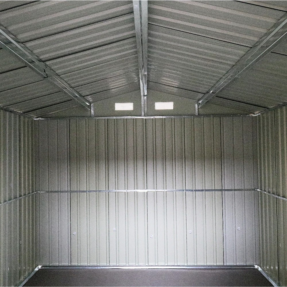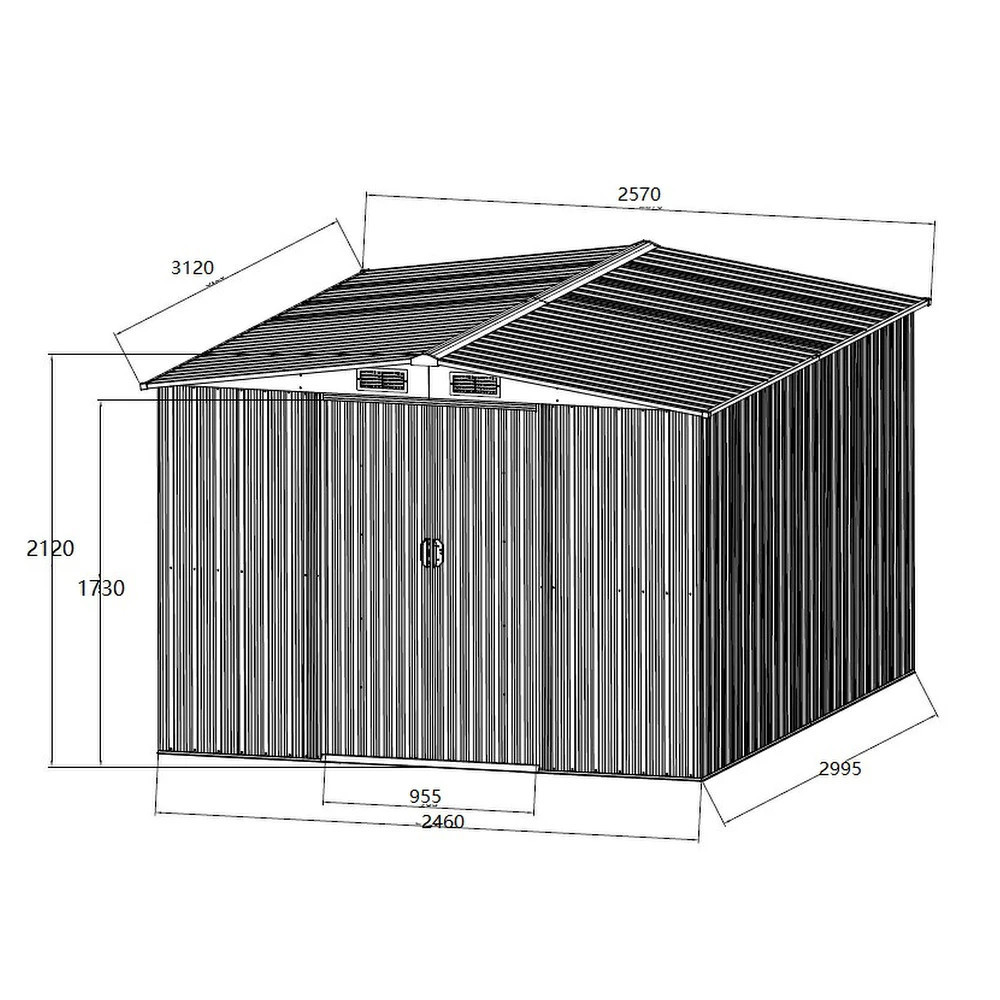 Carcasa măsoară 3120 mm x 2570 mm x 2120 mm , oferind spațiu interior amplu pentru uneltele de grădină. Ușile sunt glisante , oferind astfel o soluție de economisire a spațiului. Structura este echipată cu patru orificii de ventilație (4 guri de aerisire) , care asigură o circulație adecvată a aerului și reduc riscul de condens.