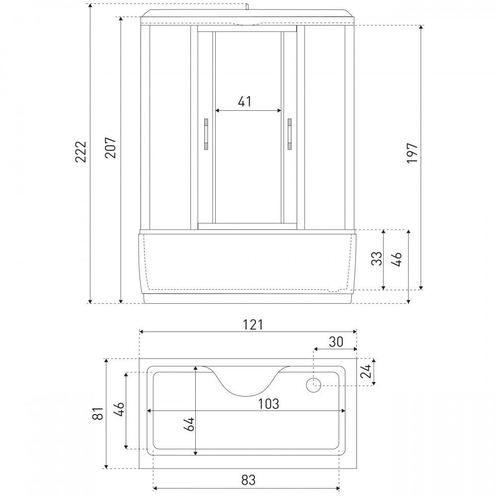 • Dimensiunea cădiței de duș: 121 x 81 x 46 cm