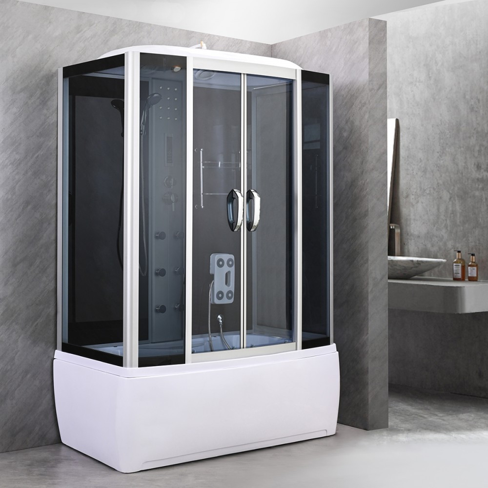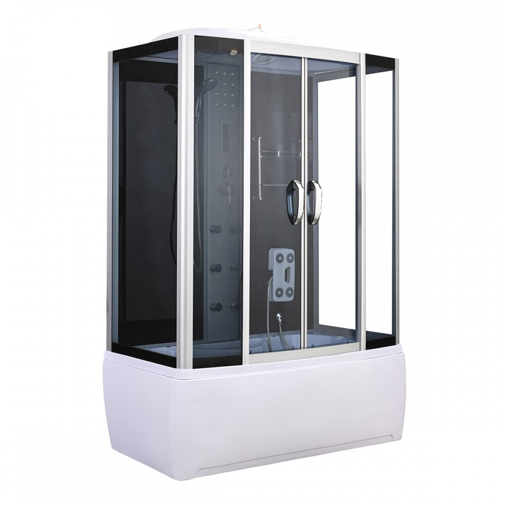 Cabina este înconjurată de sticlă securizată cu grosimea de 5 mm, care îmbunătățește aspectul estetic cu geam fix și panouri de ușă gri închis și pereți din sticlă neagră. Șinele de ghidare și profilele cromate mate sporesc și mai mult eleganța produsului, în timp ce panoul funcțional cromat mat este punctul central al opțiunilor de control. Cabina dispune de 6 jeturi de hidromasaj, care garantează o experiență de masaj pentru întregul corp, în timp ce radioul încorporat, ventilatorul, iluminarea de fundal cu LED și iluminatul de plafon sporesc și mai mult experiența de relaxare.