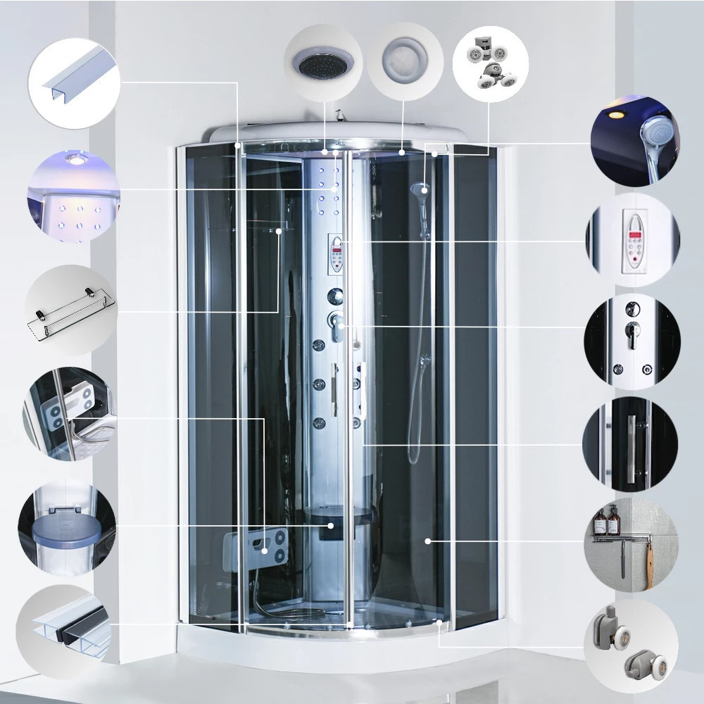 Cabina de duș este echipată cu 6 duze pentru masajul spatelui. Panoul din spate din aluminiu și electronica încorporată, panoul de control, radioul și difuzoarele permit ca fiecare duș să devină o experiență reală. Iluminarea ambientală din spate și de sus, precum și iluminarea de deasupra, sporesc și mai mult relaxarea, în timp ce raftul practic de toaletă și masajul pentru picioare asigură un confort maxim.