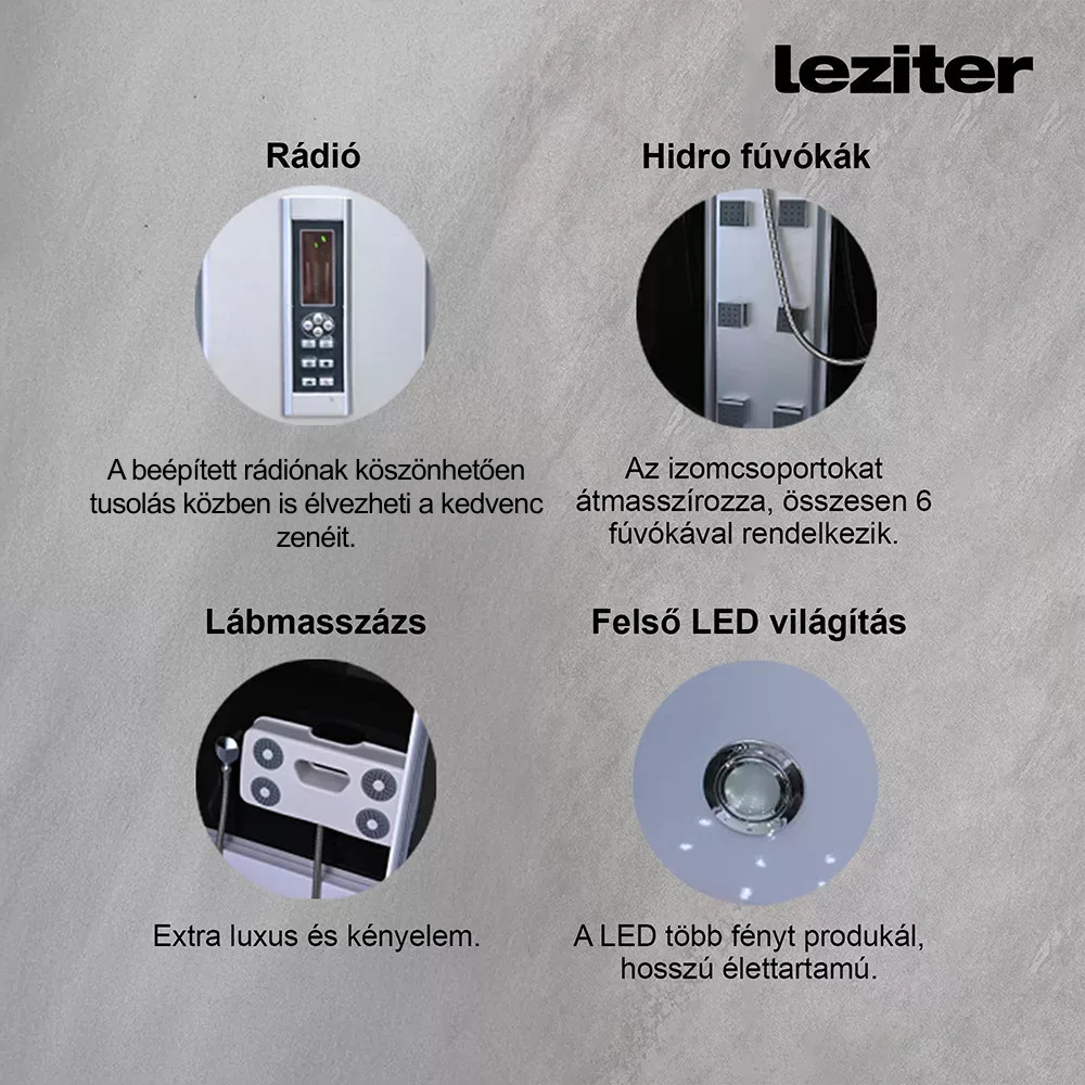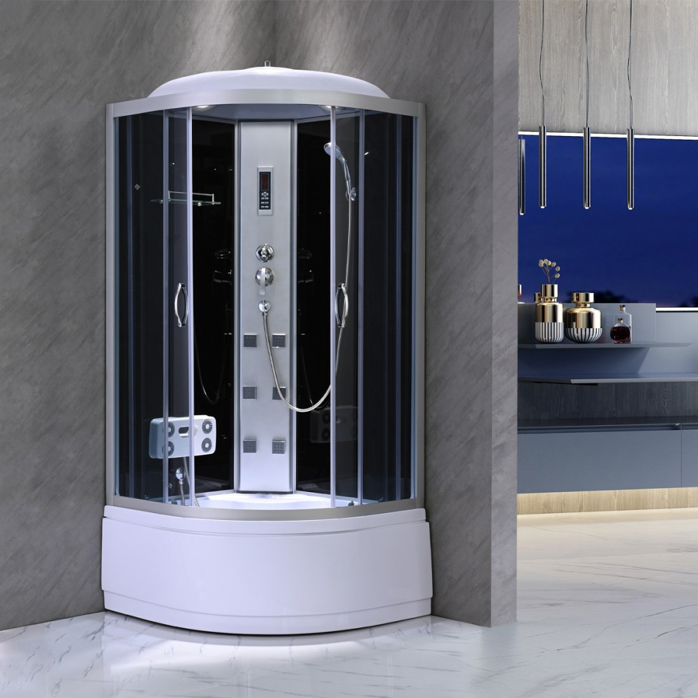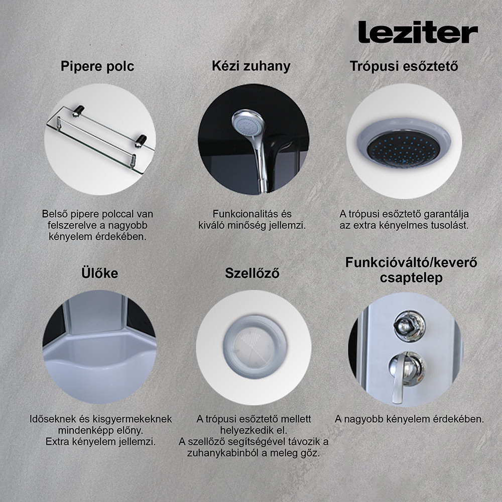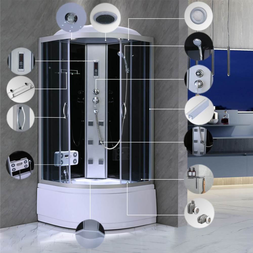 Pe lângă funcționalitate, s-a acordat o atenție deosebită și aspectului cabinei de duș cu hidromasaj. Datorită suprafeței sale din sticlă, placării negre și liniilor curate și moderne, creează un aspect elegant pentru orice baie. Cabina de duș Mila are multe funcții utile. Toaleta este dotată cu un raft, datorită căruia vă puteți păstra articolele de toaletă în ordine. De asemenea, are un duș cu efect de ploaie tropicală și un duș manual, care pot fi comutate între ele folosind selectorul de funcții. Puteți regla temperatura apei cu ajutorul robinetului mixer. Există două orificii de ventilație lângă capul de duș tropical, care permit evacuarea excesului de abur fierbinte, împiedicând umiditatea cabinei. Cabina este dotată cu 6 jeturi de hidromasaj, un aparat de masaj pentru picioare și un radio, care oferă un confort suplimentar. În plus, în cabină există iluminare încorporată.