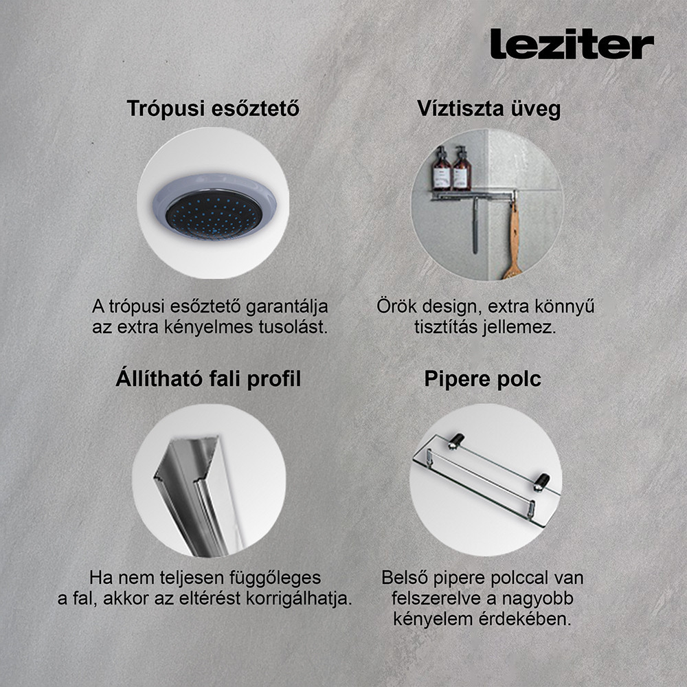 Avantajul cabinei este că are un perete în spate, datorită căruia nu trebuie să vă faceți griji că vă veți uda peretele băii. Pe lângă acestea, această cabină de duș modernă și atemporală are multe alte caracteristici pozitive. Datorită dimensiunilor sale, se potrivește confortabil în timpul dușului.