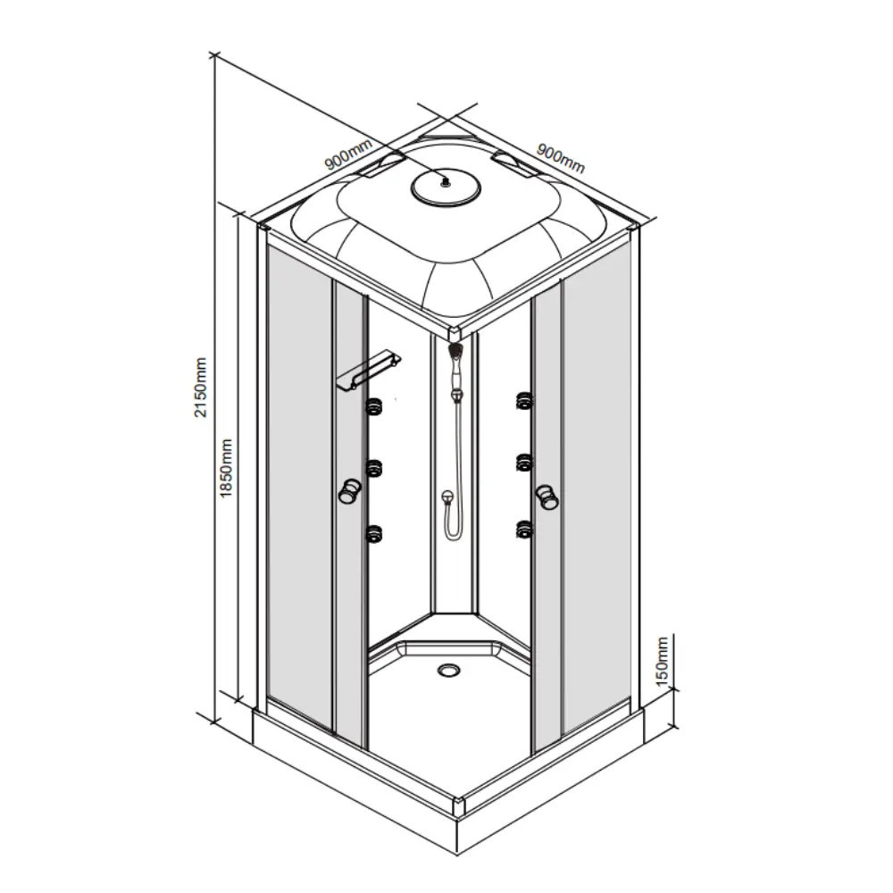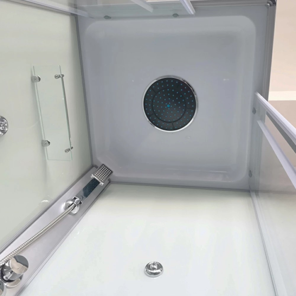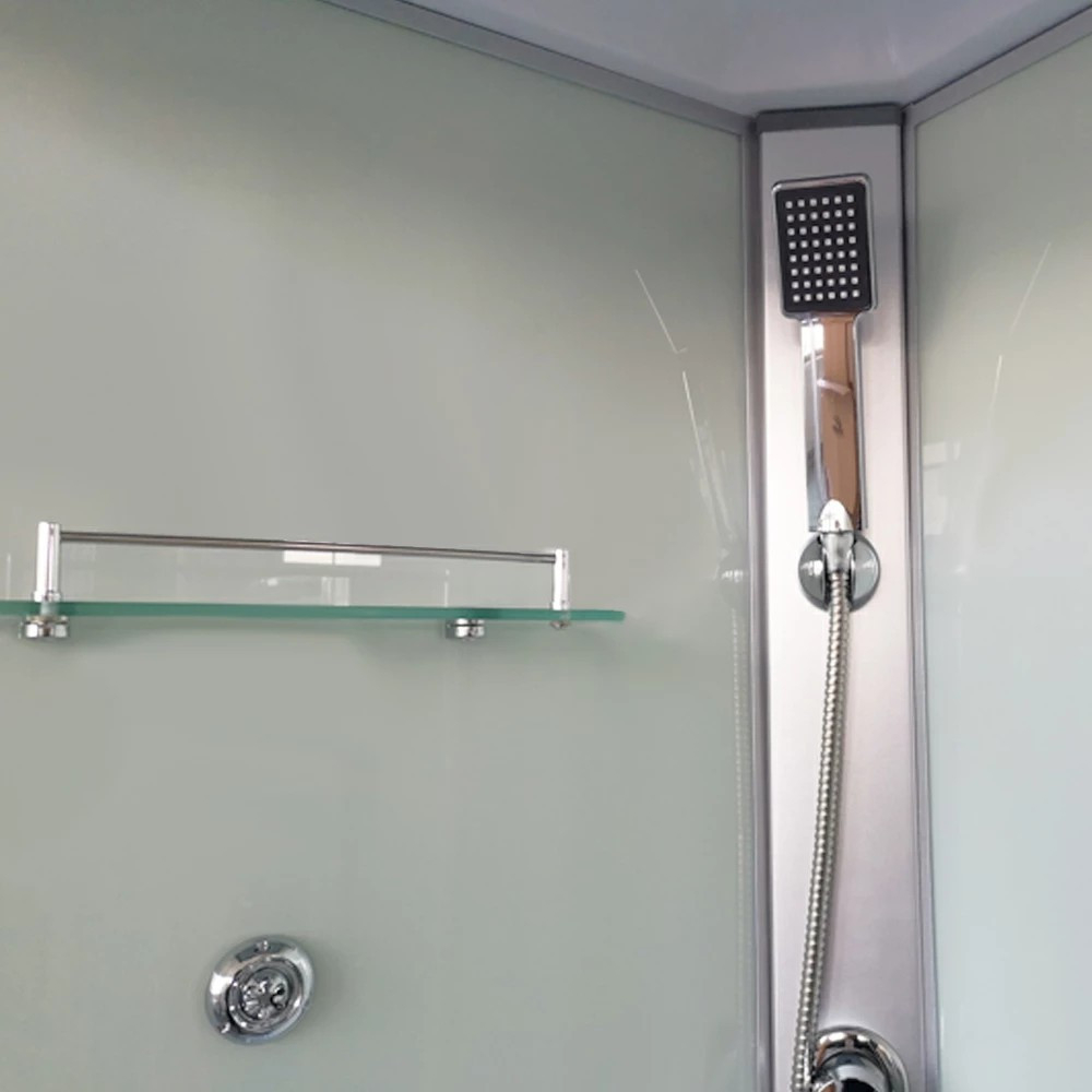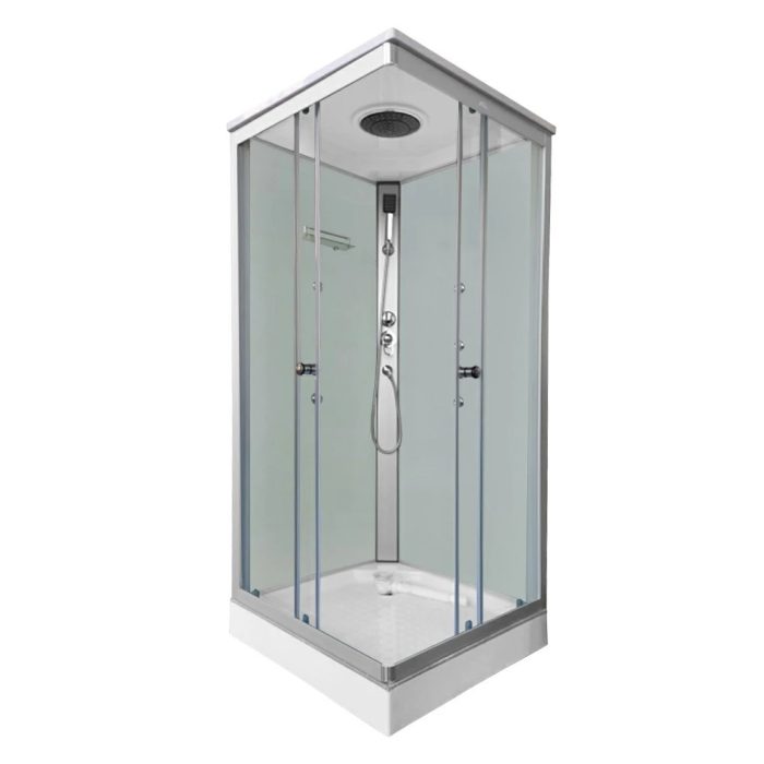 Cabina de duș Valerie este un produs extrem de elegant, care arată grozav în orice baie. Disponibil cu o cădiță de duș. Este disponibil în cinci dimensiuni: 80x80, 90x90, 70x100, 80x100, 80x120. Are un robinet mixer, o manetă selector de funcții, un raft pentru lavabou și un duș deasupra capului. Panou de duș cromat pe toată înălțimea cabinei.