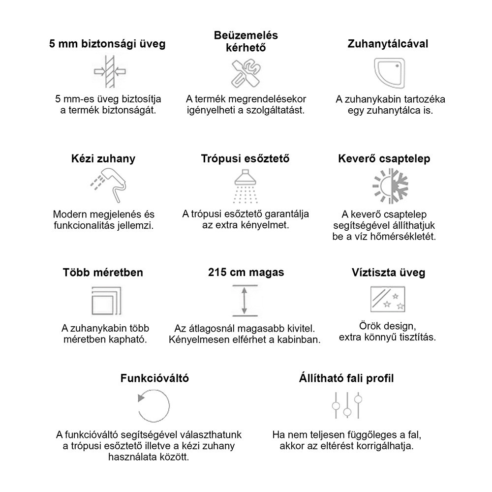 Avantajul cabinei este că are un perete în spate, datorită căruia nu trebuie să vă faceți griji că vă veți uda peretele băii. Pe lângă acestea, această cabină de duș modernă și atemporală are multe alte caracteristici pozitive. Datorită dimensiunilor sale, se potrivește confortabil în timpul dușului.