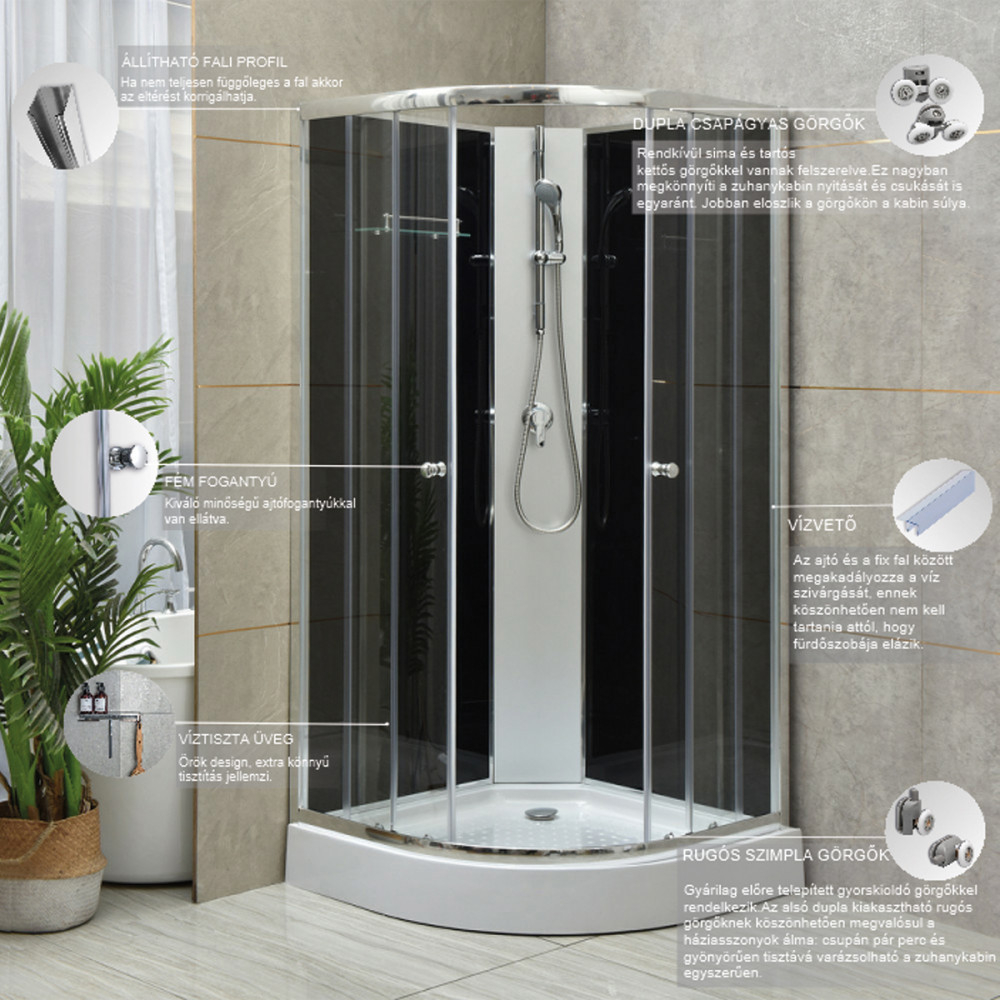 Cabina de duș Marco Black II este chintesența eleganței în baie. Acest produs este disponibil în două dimensiuni practice: 80x80x195 cm și 90x90x195 cm, ambele cu o cădiță de duș joasă. Cabina nu este doar estetică, ci și funcțională: este dotată cu un robinet mixer, o manetă selector de funcții și un raft pentru mase de toaletă. Panoul de duș cromat pe toată înălțimea creează armonia perfectă între designul modern și caracterul practic, transformând cabina de duș Marco Black II într-o bijuterie în orice baie.