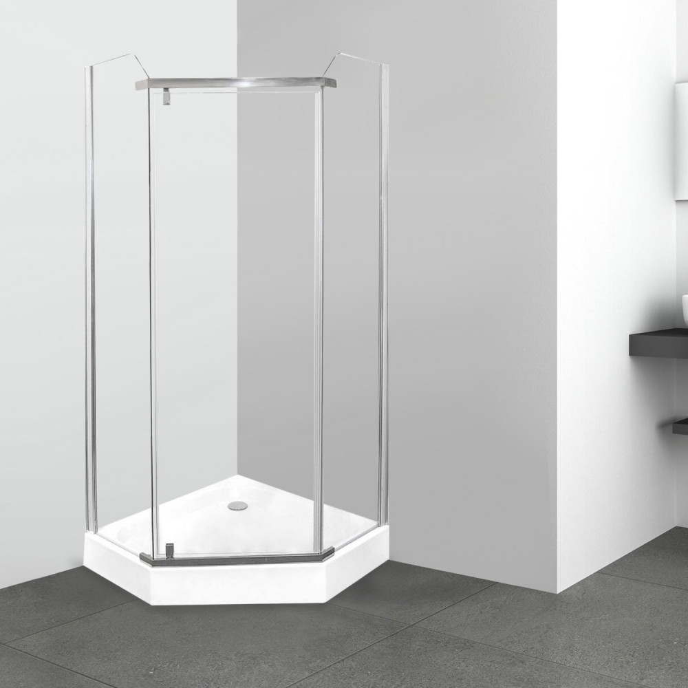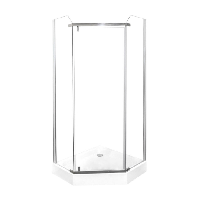 Cabină de duș cu cinci laturi și ușă batantă, fabricație europeană. Sticlă securizată securizată de 6 mm