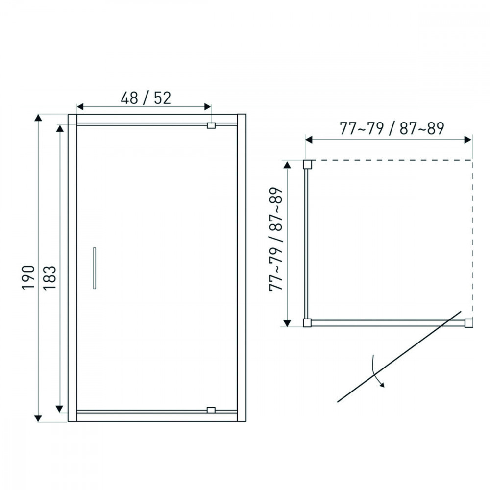 Cabina de duș pătrată Tomar măsoară 80 x 80 x 190 cm și este reglabilă până la 3 cm. Are profile negre, din aluminiu, care se potrivesc perfect cu sticla mată cu dungi grafit. Ușa cabinei Tomar este cu o singură canat, cu balamale.