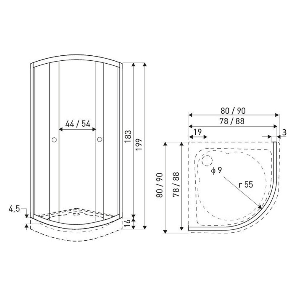 Cabina de duș este fabricată din sticlă securizată de 4 mm. Este echipat cu sticlă securizată decorată cu pătrate decorative negre . Cabina de duș este disponibilă într-un design curbat. Este echipat cu uși duble tip rulou. Cabina măsoară 79x79x183 cm ( înălțime totală cu tavă: 79x79x199 cm ). Cădița de duș din acril alb are dimensiunile de 79x79x16 cm !