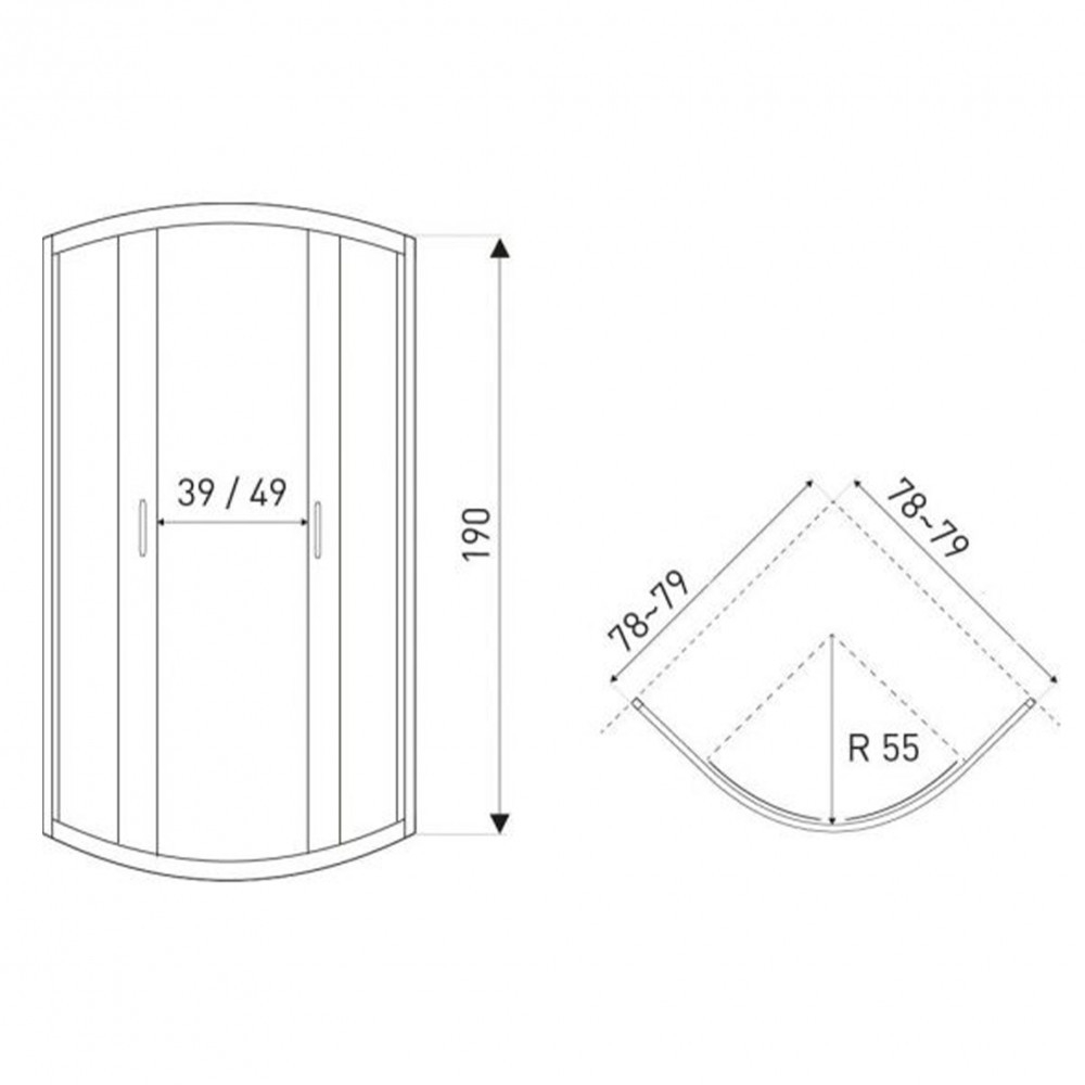 Cabina de duș este echipată cu sticlă securizată de 6 mm . Dimensiunile sale sunt 79x79x190 cm. Sticla cabinei de duș este prevăzută cu un strat protector hidrofug. Are uși glisante duble. Poate fi instalată cu o cădiță de duș curbată din acril R55. (Modelul ALAN sau ARON.) Poate fi achiziționat separat.