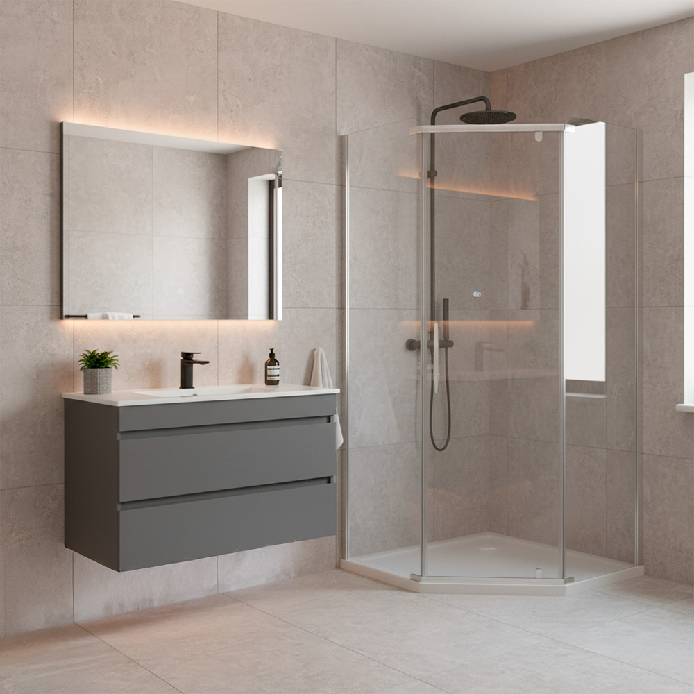 Tava de duș pentagonală Leziter Modena Slim asortată are doar 5 cm înălțime și se integrează discret în gresie, creând un efect aerisit, modern.