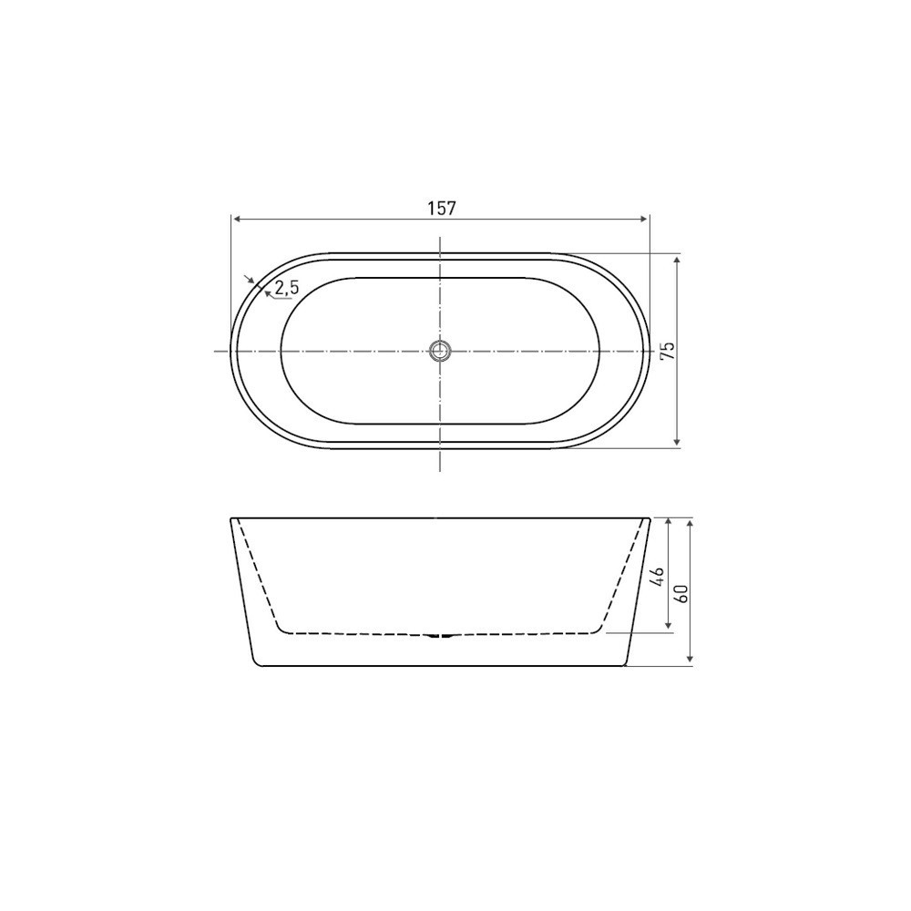 Dimensiuni exterioare: lățime totală 74 cm, lungime totală 157 cm, înălțime totală 61 cm. Dimensiuni interne: lățimea căzii 69 cm, fundul căzii 53 cm lățime, lungimea căzii 151 cm, lungimea fundului căzii 120 cm. Adâncime totală 45 cm. Diametrul scurgerii este de 5 cm. Forma sa este ovală, care radiază eleganță și claritate. Include scurgere tip clic-clack și sifon. Cada se află pe un cadru ascuns.