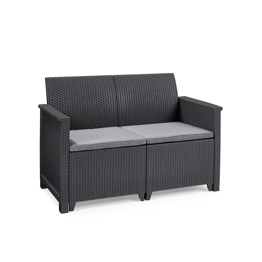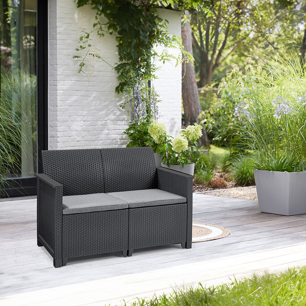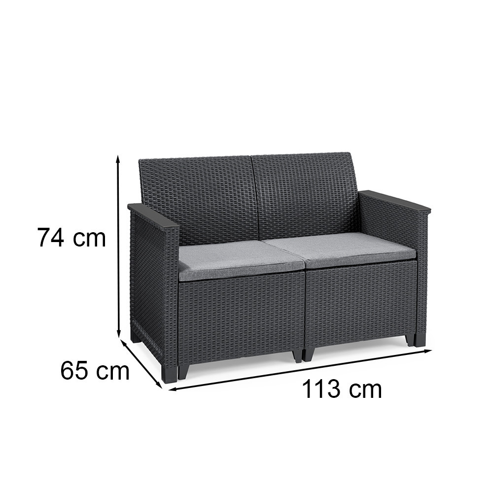 Materiale durabile: Canapeaua este fabricată din plastic durabil și de înaltă calitate, fiind rezistentă la deteriorări și la condițiile meteorologice pe termen lung, precum și la radiațiile UV. Datorită culorii sale grafit, tolerează bine murdăria și culoarea sa nu se estompează.