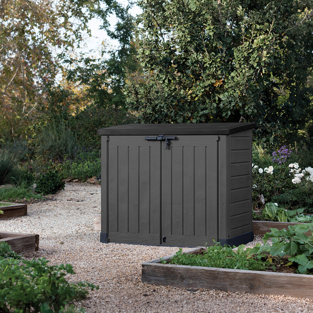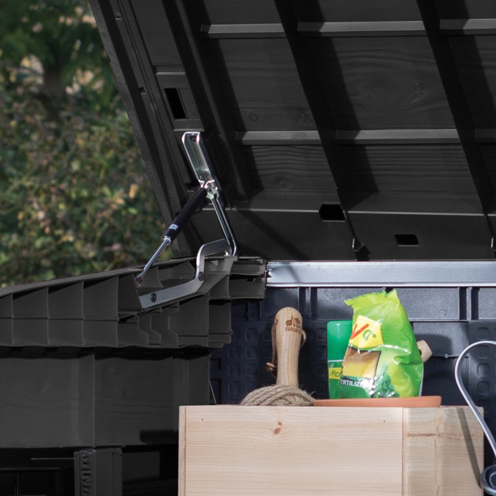Culoarea gri închis oferă depozitului un aspect modern, discret, care se potrivește cu ușurință cu o varietate de stiluri arhitecturale de grădină. Designul său compact, dar cu capacitate mare, vă permite să vă păstrați grădina ordonată și transparentă.