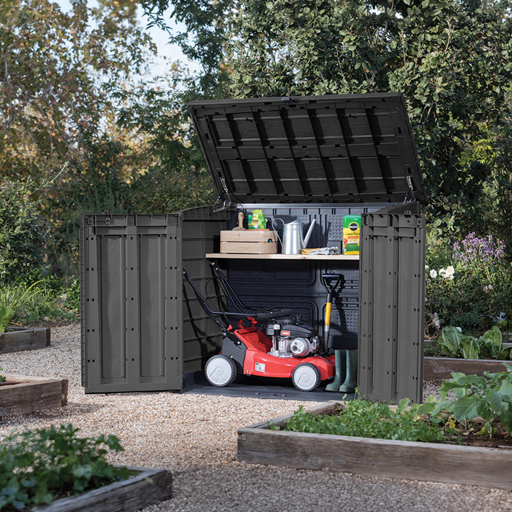 Containerul de plastic pentru grădină Store It Out Max de 1200 L este alegerea ideală atunci când este necesară o soluție mare de depozitare în aer liber. Capacitatea de 1200 de litri oferă suficient spațiu pentru unelte de grădină, utilaje de grădină, perne sau chiar containere de deșeuri multiple. Acoperișul cu balamale și ușa frontală bi-pliabilă oferă acces convenabil la articolele depozitate.
