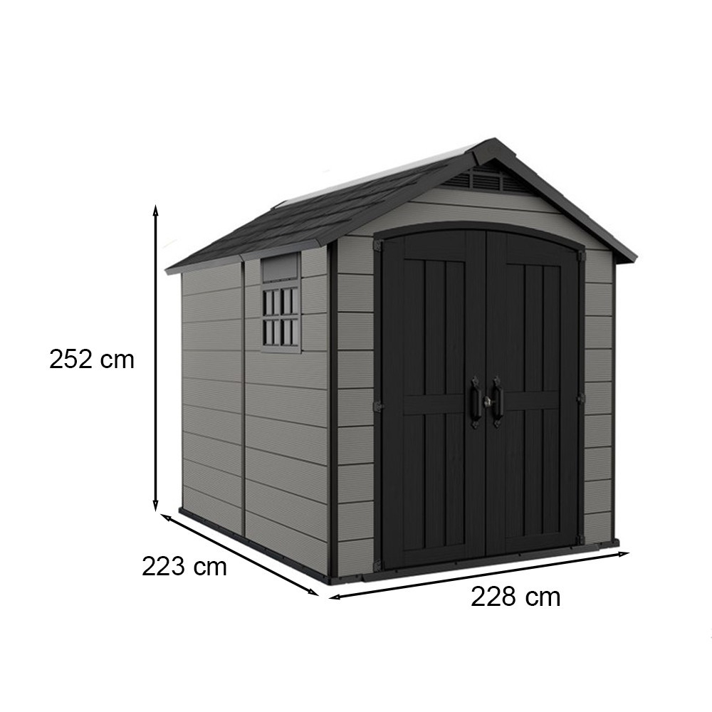 Dimensiunile produsului - 228 cm lățime, 287 cm adâncime și 252 cm înălțime - sunt ideale pentru a oferi un spațiu amplu de depozitare pentru unelte de grădină, utilaje și mobilier.