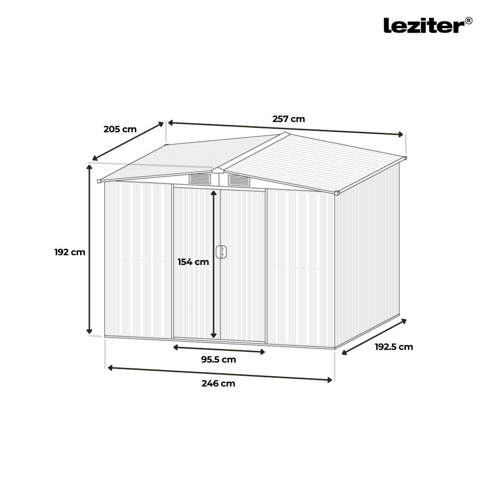 A két tolóajtóval kialakított bejárat helytakarékos megoldást kínál, mivel az ajtók nyitáskor nem igényelnek plusz teret. Ennek köszönhetően a tároló jól elhelyezhető kerítés vagy fal közelében is. A praktikus ajtónyílás megkönnyíti a kerti eszközök, gépek és tárolódobozok be- és kipakolását a mindennapi használat során.