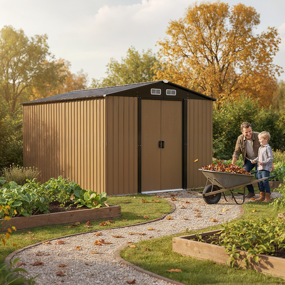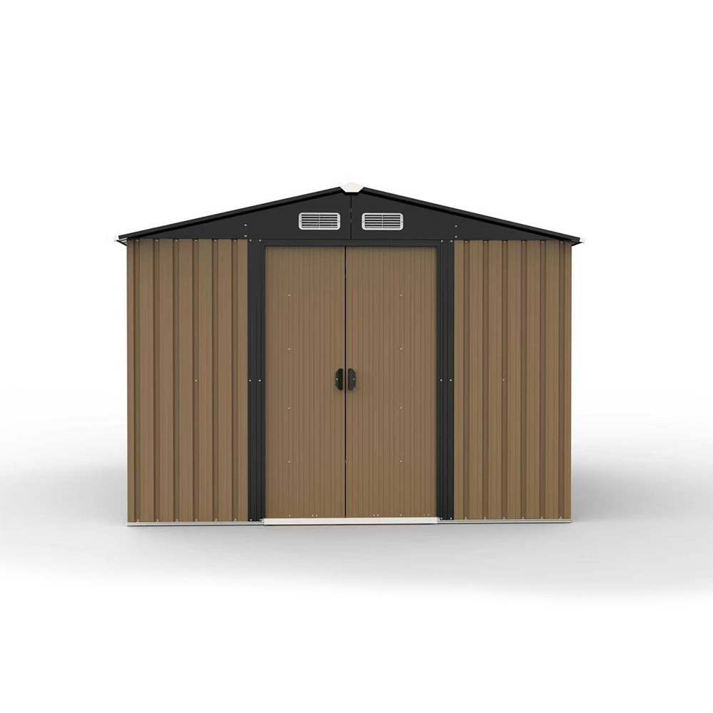 A szerkezet alapját horganyzott acél váz adja, amely stabil tartást biztosít a teljes felépítménynek. A falak színezett acéllemezből készülnek. Ez a kialakítás hosszú távon is megbízható megoldást jelent a kerti tárolásra.