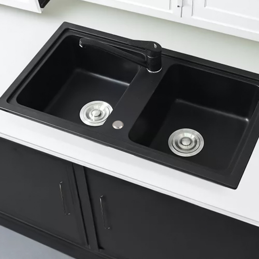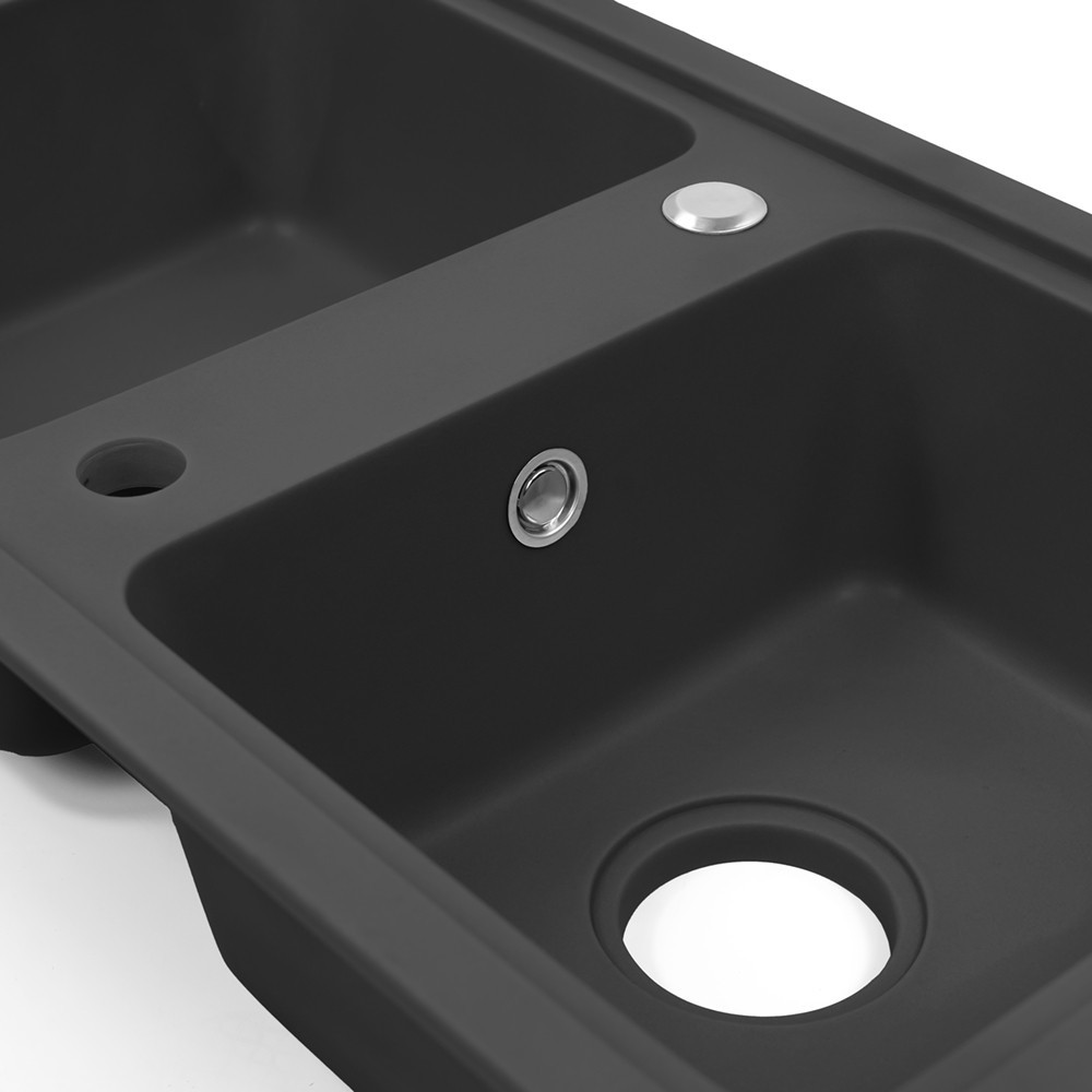 Chiuveta pătrată Tia din granit cu două cuve, de culoare neagră, va deveni noua piesă centrală a bucătăriei tale. Două lavoare asigură o muncă confortabilă și eficientă, în timp ce finisajul din granit negru emană eleganță și stil.
