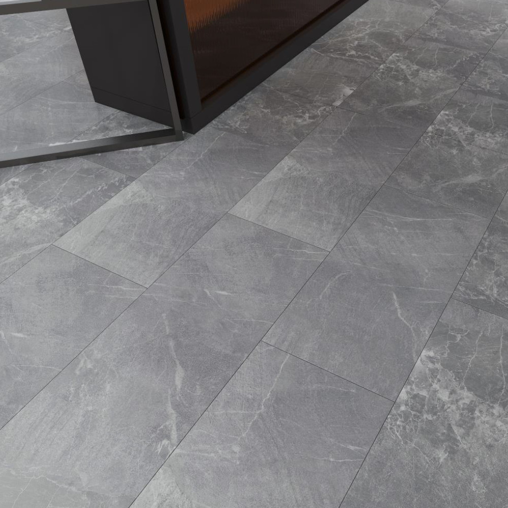 Pardoseala cu model de marmură Fjord gri închis oferă un efect de piatră caracteristic, modern și natural. Nuanțele sale adânci și întunecate creează o atmosferă elegantă și exclusivistă, fiind alegerea ideală pentru locuințe moderne, birouri sau magazine.