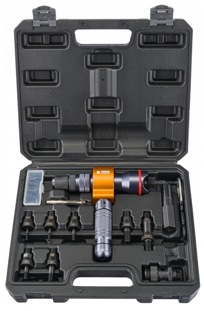 Mașină de nituit profesională 3 în 1 POWERMAT, datorită căreia puteți realiza fixări cu nituri și piulițe nituibile incredibil de ușor și rapid. Rama ergonomică mică, cu mecanism intern ranforsat, rulmenți și mâner în formă de T, permite aplicarea forțelor mari necesare pentru a lucra cu cele mai mari și mai dure nituri și piulițe nituibile.