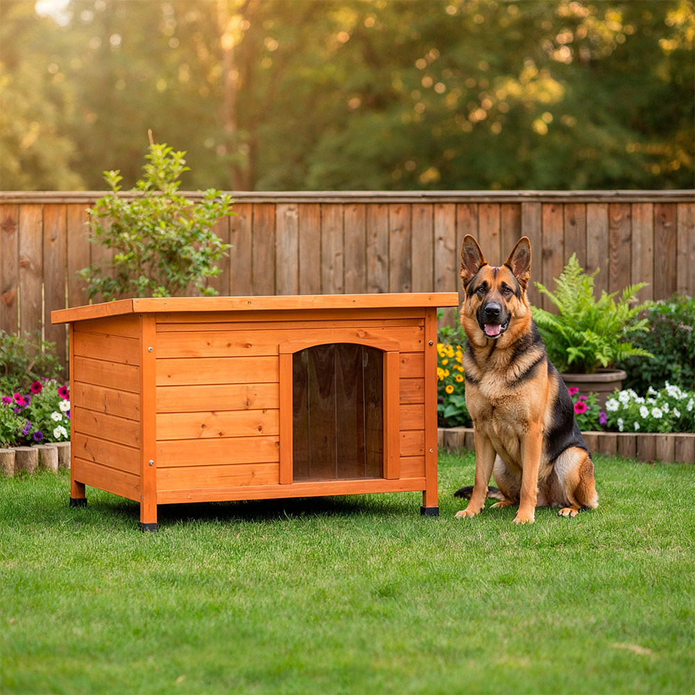 Una dintre caracteristicile cheie ale acestei căsuțe pentru câini este acoperișul plat, care permite adaptarea ușoară a căsuței în spații înguste. În plus, proeminențele acoperișului protejează totul de ploaie. Capacele de cauciuc cu înălțime reglabilă de la baza adăpostului pentru câini asigură stabilitatea și îl protejează de umezeală, permițând în același timp aerului să circule pe sub casă, oferind o protecție excelentă animalului dvs. de companie împotriva frigului și umezelii de pe sol.