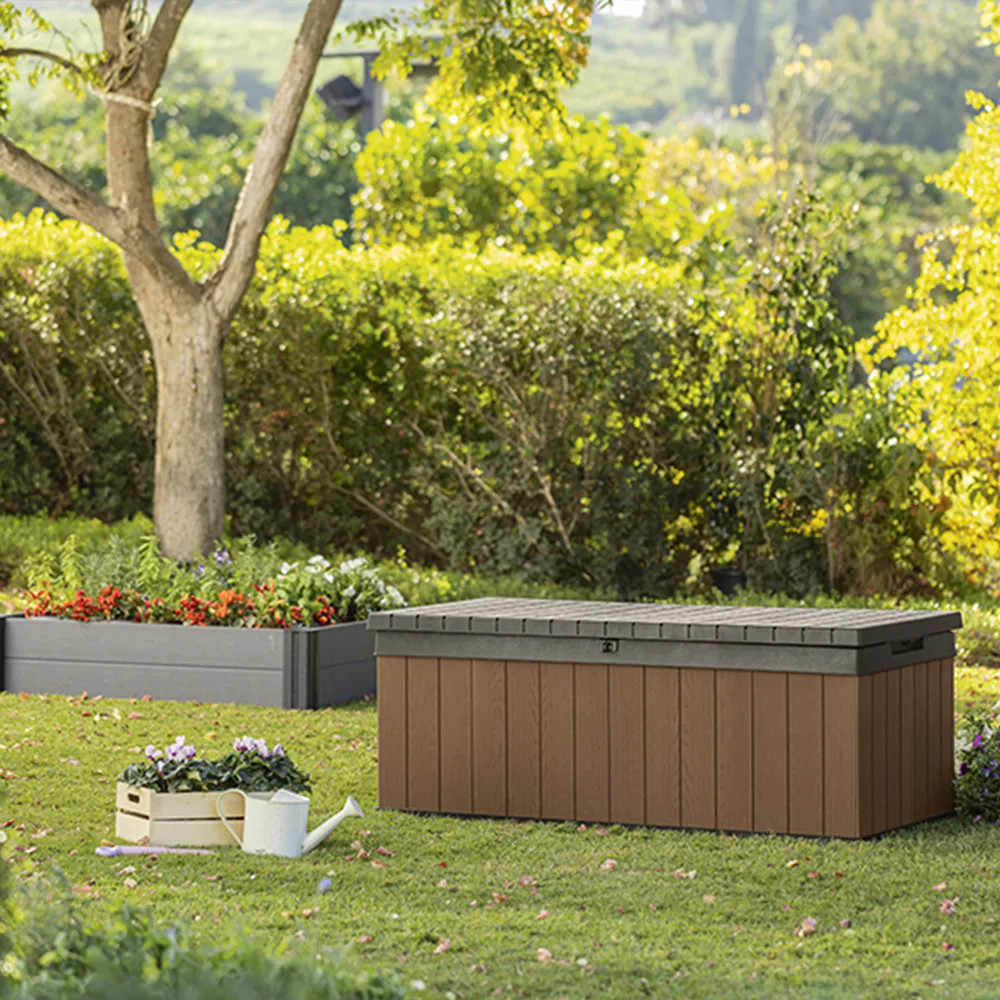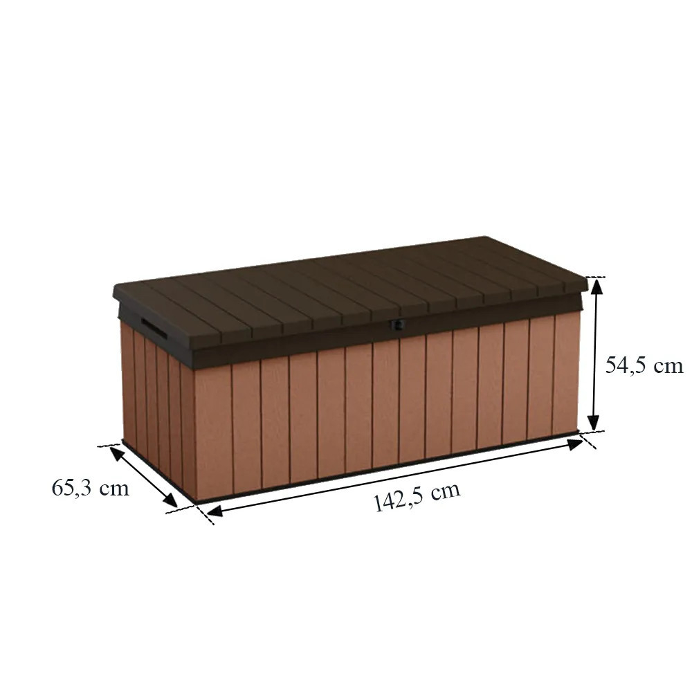 Lada de grădină funcțională și spațioasă, cu o capacitate de 380 de litri, a fost fabricată de renumita companie Keter, care are o vastă experiență în crearea de echipamente de grădină din plastic. O unitate de depozitare pentru grădină este locul perfect pentru a depozita perne pentru scaune de grădină, jucării sau alte echipamente de grădină. Deși arată ca o cutie de grădină din lemn, aceasta este doar o procedură stilistică implementată în timpul procesului de fabricație. Cutia de depozitare de grădină Keter Darwin este fabricată în întregime din plastic rezistent și durabil. Datorită acestui fapt, este impermeabil, rezistent la radiațiile UV și ecologic. Majoritatea materialelor folosite pentru fabricarea produselor Keter provin din reciclare.