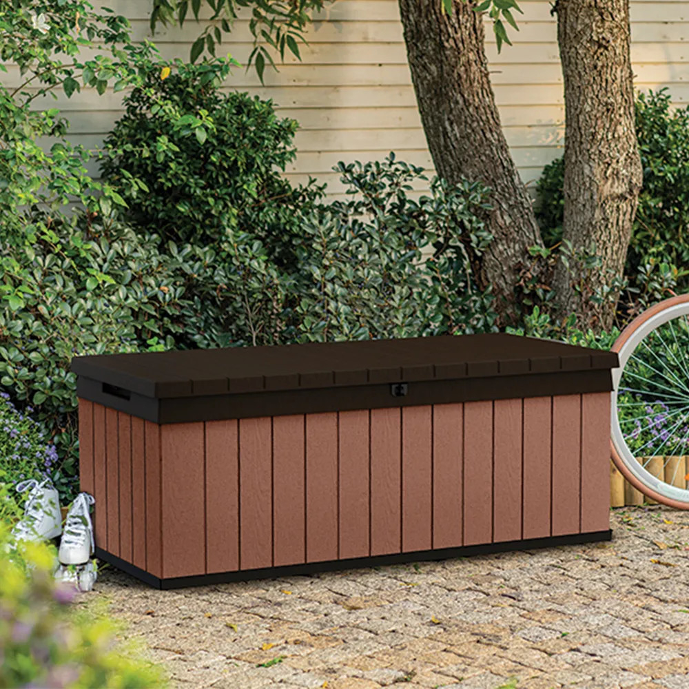 Depozitare de grădină Darwin - practică - perfectă pentru depozitarea uneltelor și jucăriilor de grădină. Exteriorul cu textură de lemn îi conferă un aspect elegant și se potrivește perfect cu aspectul grădinii dumneavoastră. Construcția durabilă și rezistentă la intemperii a lăzii nu va rugini, nu va deteriora fizic și nu va mucegăi - va arăta la fel de frumos și după mulți ani de utilizare. Mânerele laterale permit o mișcare ușoară, iar capacul cu încuietoare protejează conținutul.