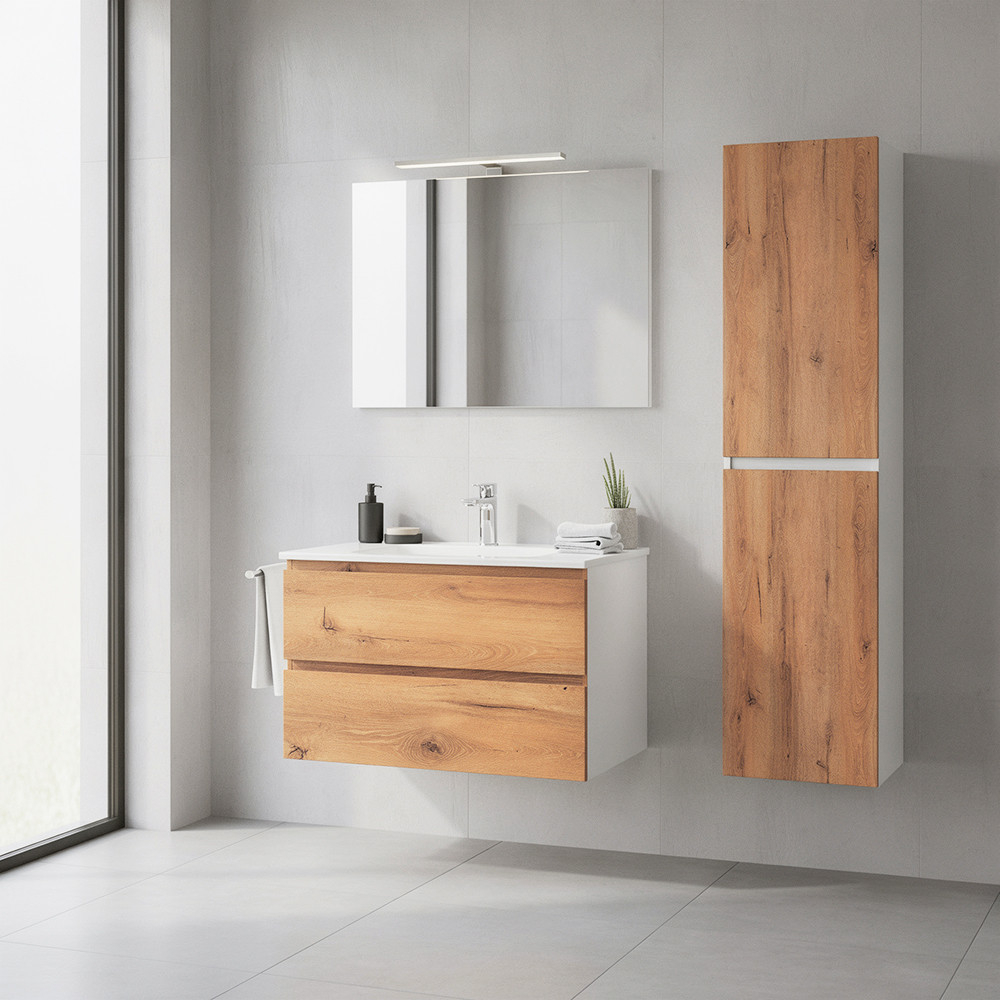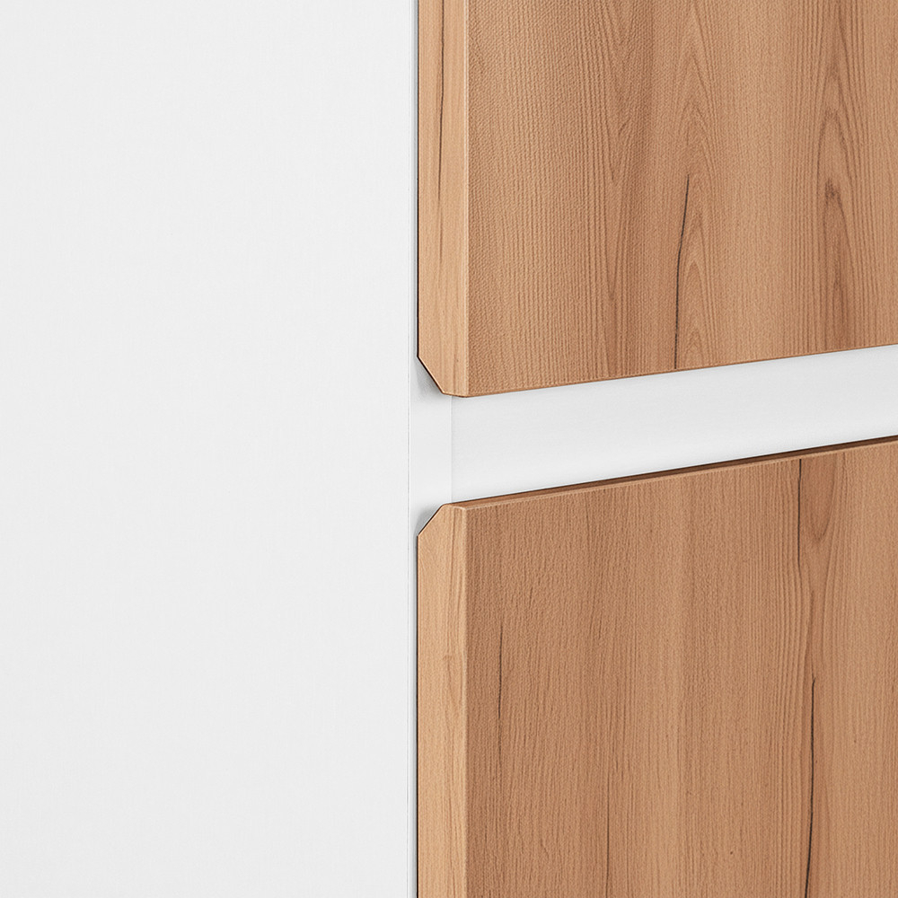 Dulapul lateral suspendat Vario Forte 35 oferă băii un aspect modern și curat, facilitând în același timp curățenia zilnică: podeaua este lăsată liberă dedesubt, oferind spațiului o senzație mai spațioasă și mai neîngrijită. poate fi echipat cu uși atât la stânga, cât și la dreapta, ceea ce este deosebit de avantajos în băile mici, unde fiecare centimetru contează. Mânerul metalic Forte accentuează și mai mult caracterul elegant și modern al mobilierului; acesta oferă o prindere durabilă și confortabilă și se îmbină armonios cu aspectul sofisticat al suprafețelor din stejar alb.