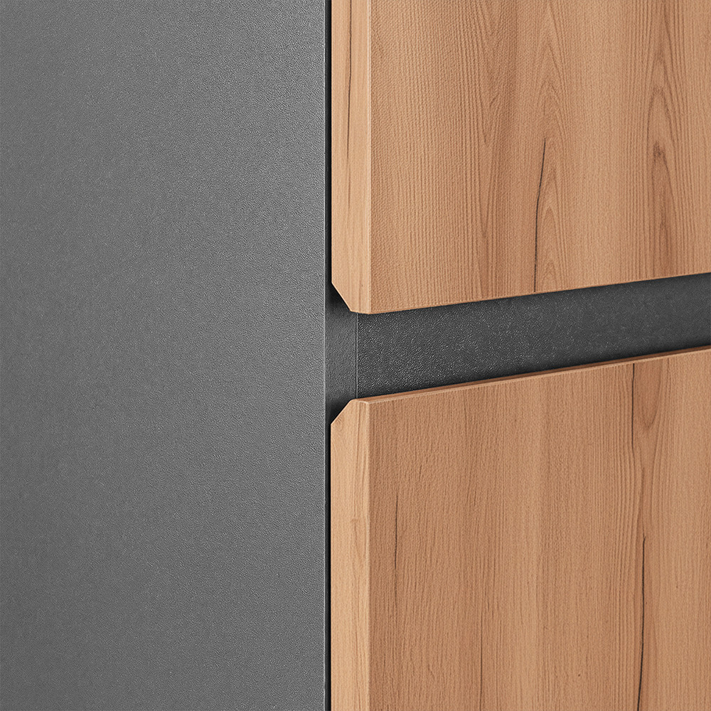Dulapul lateral suspendat Vario Forte 35 oferă băii un aspect modern și curat, facilitând în același timp curățenia zilnică: podeaua este lăsată liberă dedesubt, oferind spațiului o senzație mai spațioasă și mai neîngrijită. poate fi echipat cu uși atât la stânga, cât și la dreapta, ceea ce este deosebit de avantajos în băile mici, unde fiecare centimetru contează. Mânerul metalic Forte accentuează și mai mult caracterul elegant și modern al mobilierului; acesta oferă o prindere durabilă și confortabilă și se îmbină armonios cu aspectul sofisticat al suprafețelor din stejar antracit.