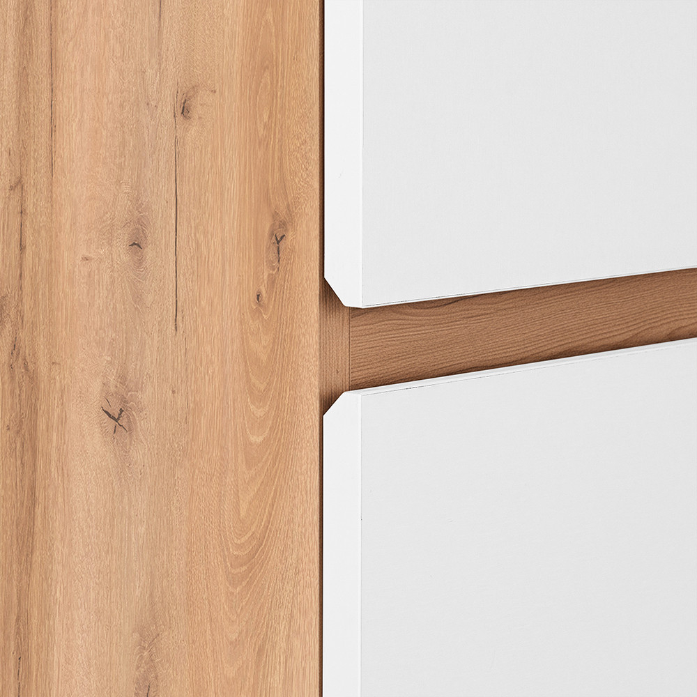 Dulapul lateral suspendat Vario Forte 35 oferă băii un aspect modern și curat, facilitând în același timp curățenia zilnică: podeaua este lăsată liberă dedesubt, oferind spațiului o senzație mai spațioasă și mai neîngrijită. poate fi echipat cu uși atât la stânga, cât și la dreapta, ceea ce este deosebit de avantajos în băile mici, unde fiecare centimetru contează. Mânerul metalic Forte accentuează și mai mult caracterul elegant și modern al mobilierului; acesta oferă o prindere durabilă și confortabilă și se îmbină armonios cu aspectul sofisticat al suprafețelor albe de stejar.