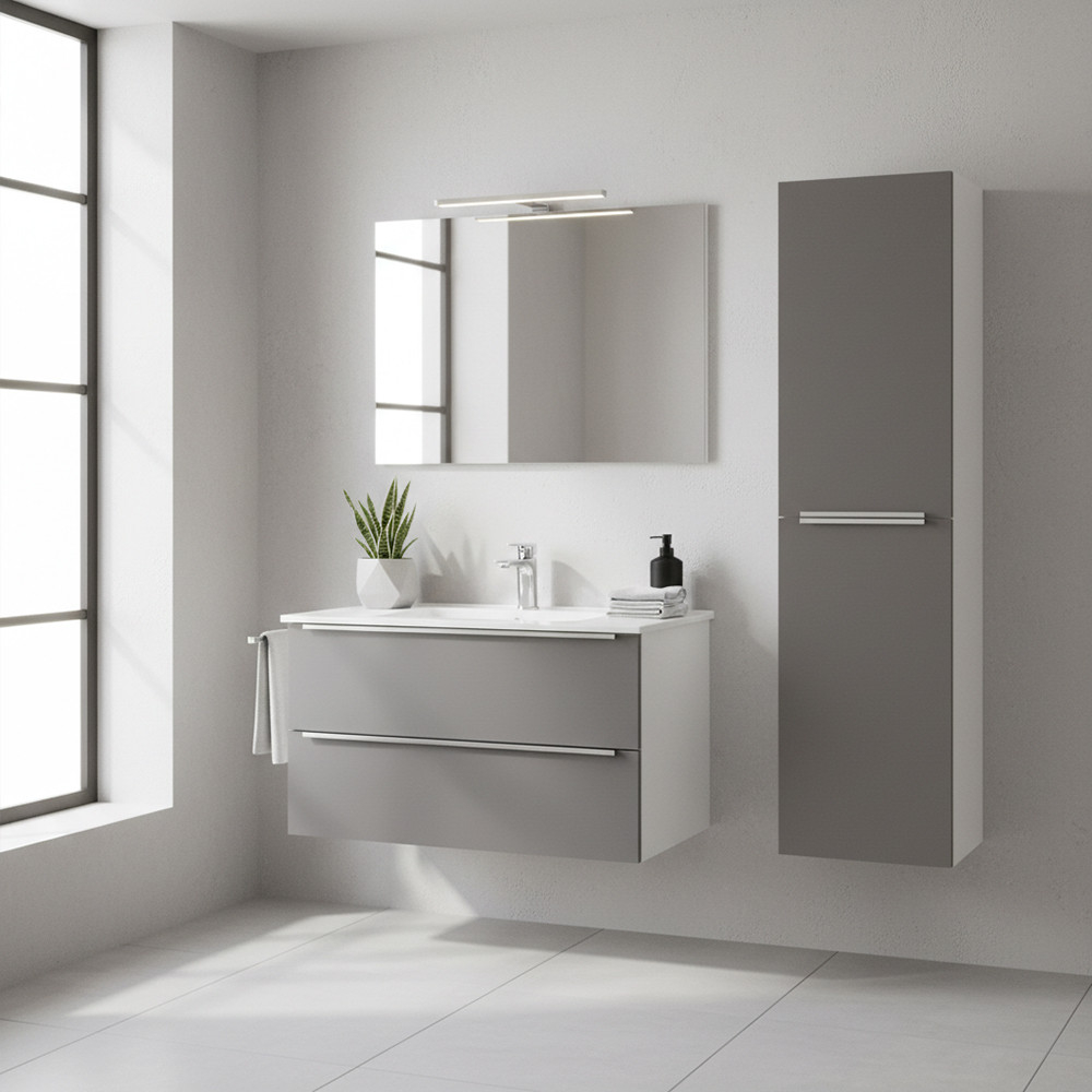 Dulapul lateral suspendat Vario Trim 35cu design suspendat oferă băii un aspect modern și curat, facilitând în același timp curățenia zilnică: podeaua este lăsată liberă dedesubt, făcând ca spațiul să pară mai spațios și mai ordonat. Ușa poate fi montată atât în stânga, cât și în dreapta, ceea ce este deosebit de avantajos în băile mici, unde fiecare centimetru contează.Dulapul este fabricat din panouri de mobilier durabile care rezistă la umiditatea zilnică din baie.Suprafețele sunt ușor de curățat. Profilul mânerului metalic Trim accentuează și mai mult caracterul elegant și modern al mobilierului; acesta oferă confort în utilizare și se îmbină armonios cu aspectul sofisticat al suprafețelor albe antracit.